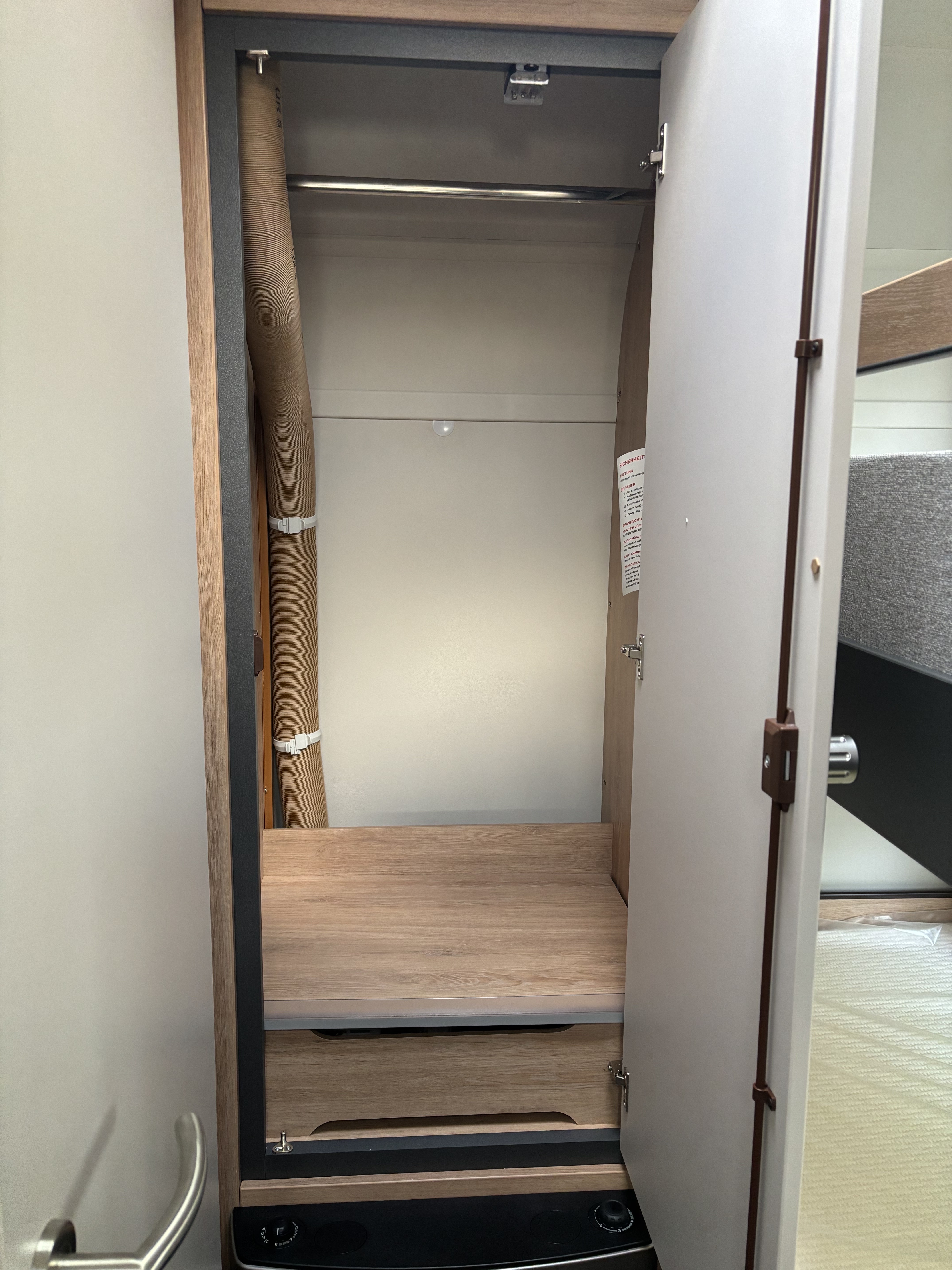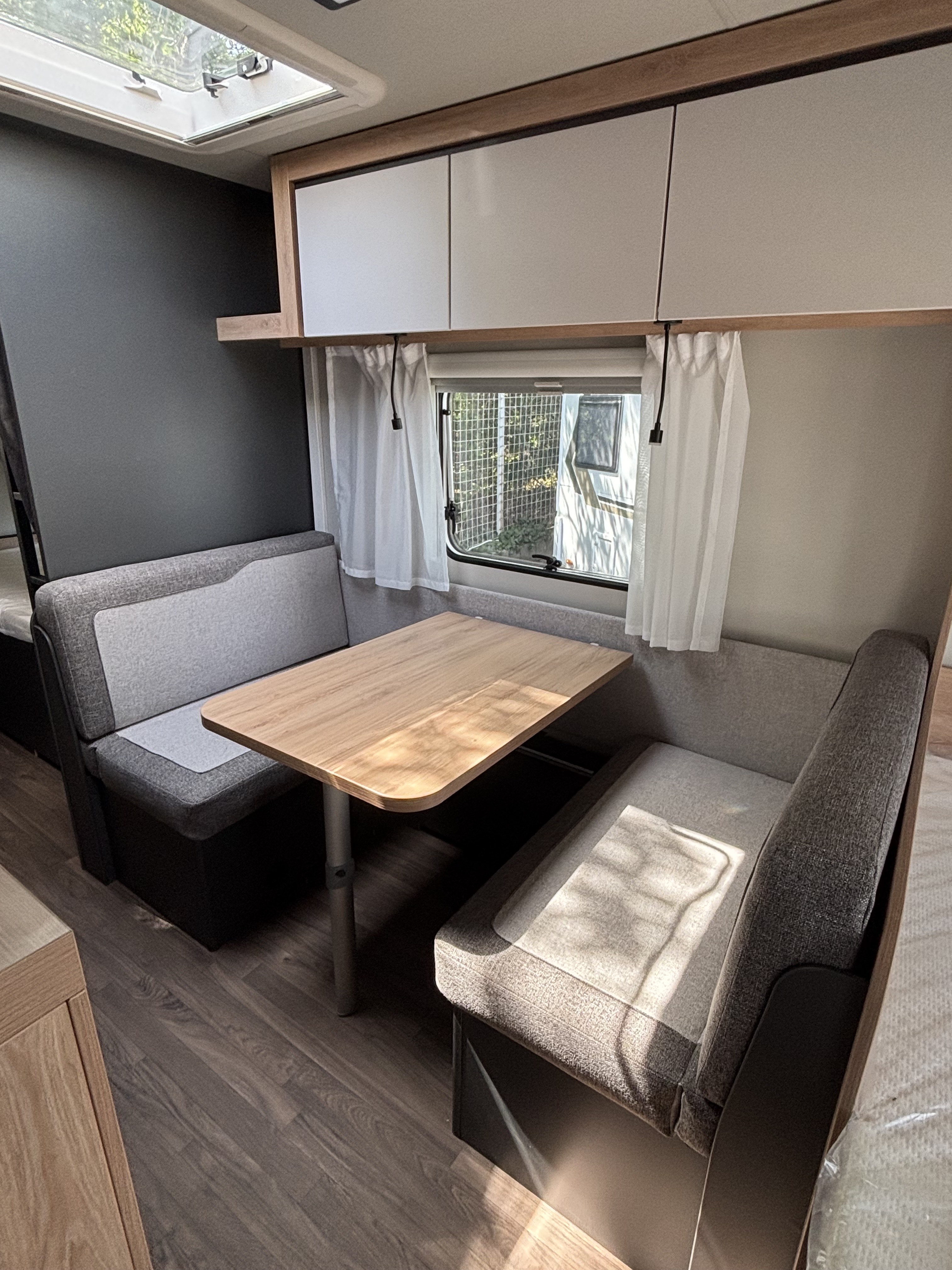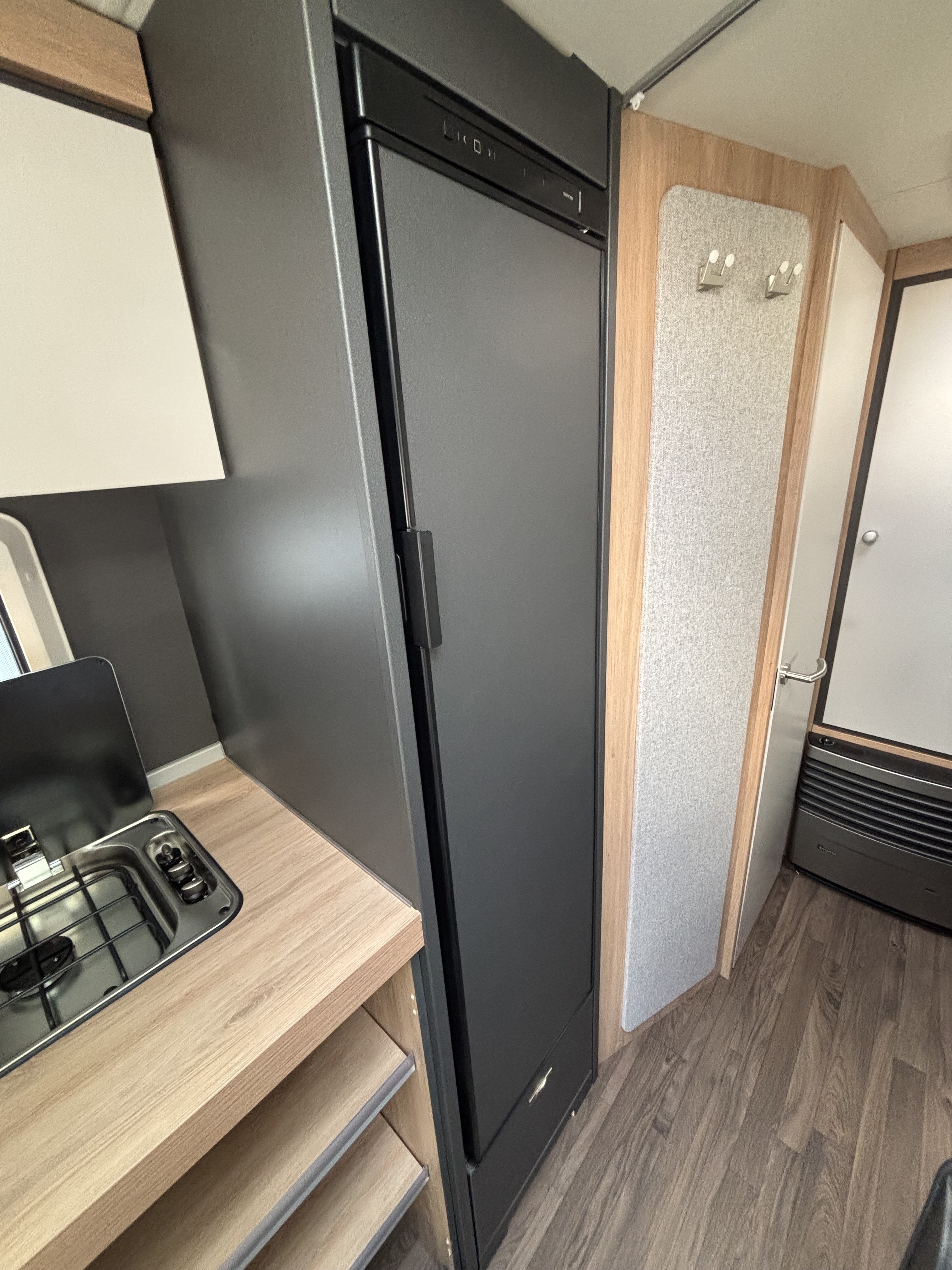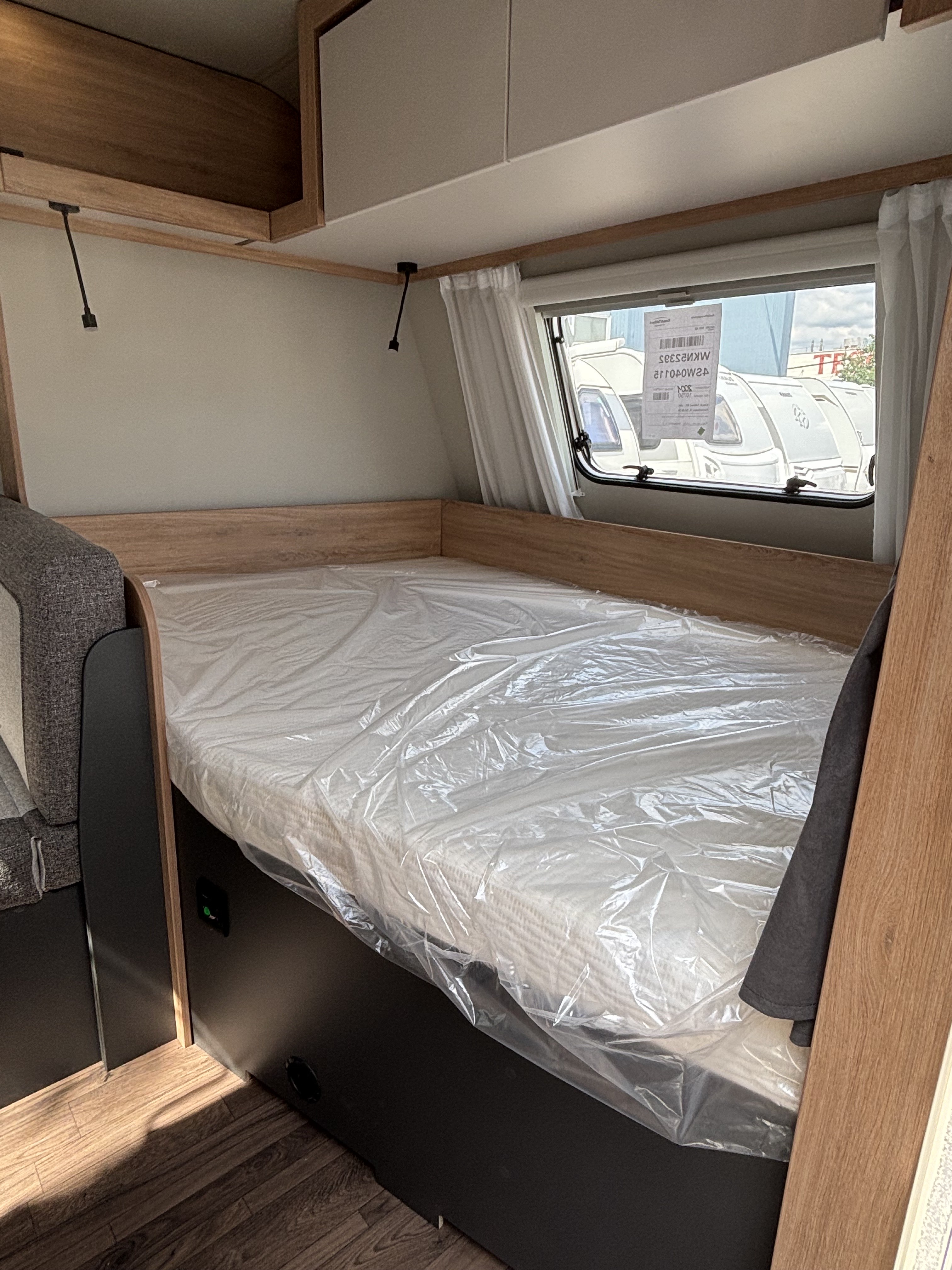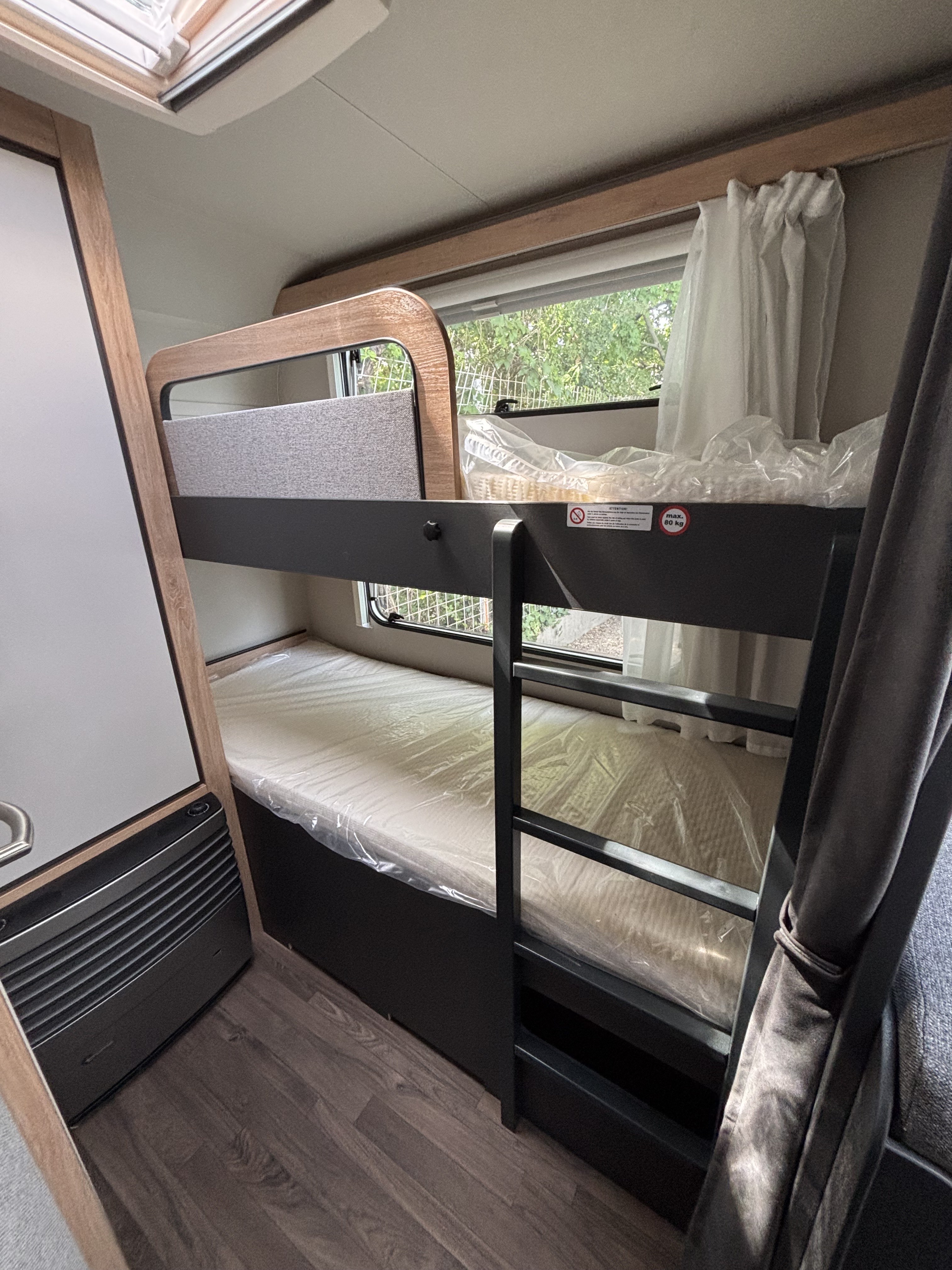 Mosogató, 142 L-es Thetford automata hűtő, 3 égőfejes tűzhely, 45L-es beépített víztartály, mosdófülke beépített bio-Wc-vel, hideg-meleg vízrendszer, külső vízbetöltőnyílás, Truma S 5004 gázfűtés, kombiroló, szugonyhálós ajtó, 40 cm x 40 cm-es tetőablak hátul, térelválasztó, EvoPore HRC matrac, emeletes ágy, összecsukható ruhaállvány, LED belső hangukat világítás