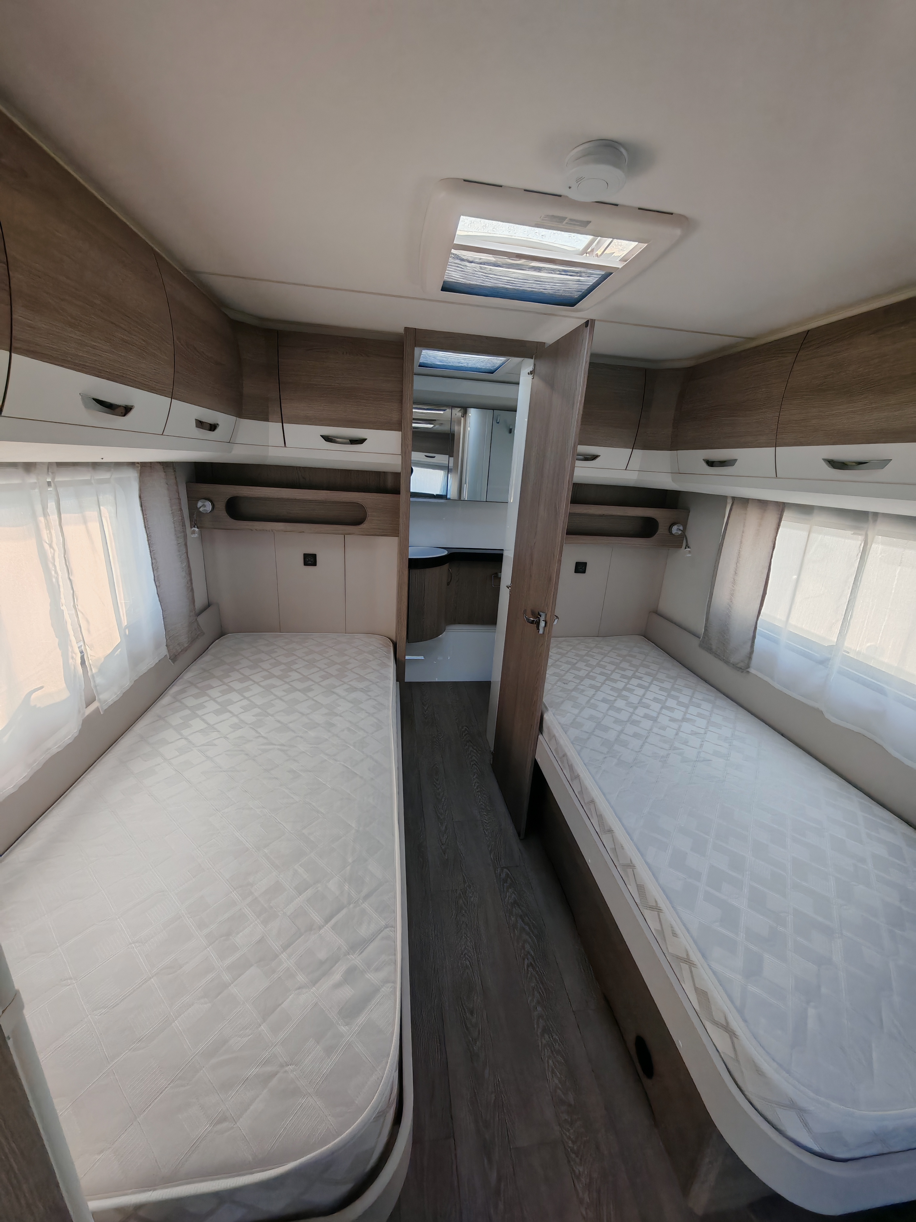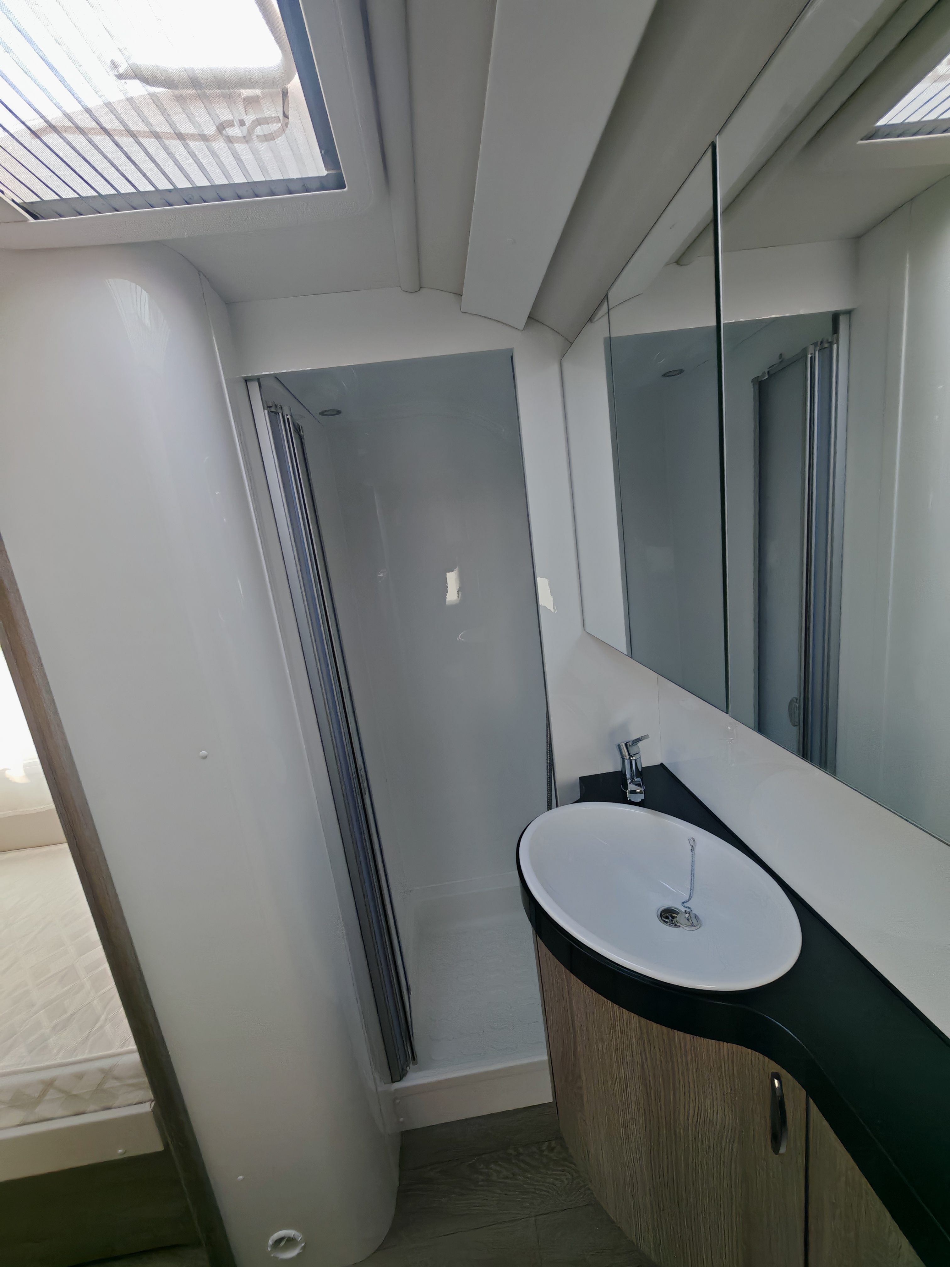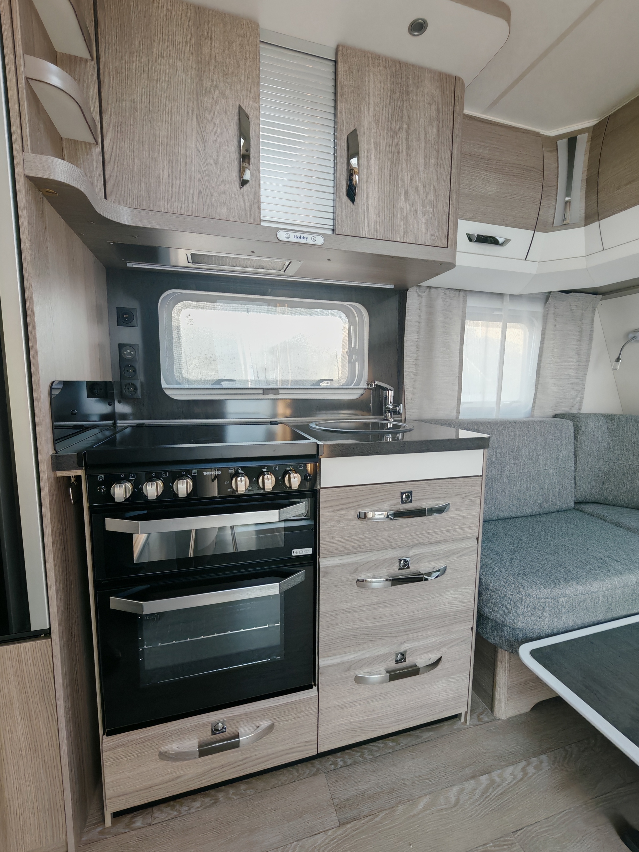 Fekvőhelyek száma: 4 fő, mosogató, toronyhűtő, 3 égőfejes tűzhely, Thetford sütő, mosdófülke beépített bio-Wc-vel és zuhanytálcával,  hideg-meleg vízrendszer, beépített víztartály, szennyvíztartály, panoráma tetőablak, kombirolók, Truma INet központ, gázriasztó, térelválasztó,  gardróbszekrény, olvasólámpa, Sinclair tetőklíma, TV, padlófűtés, Truma Combi gáz-elektromos kazán