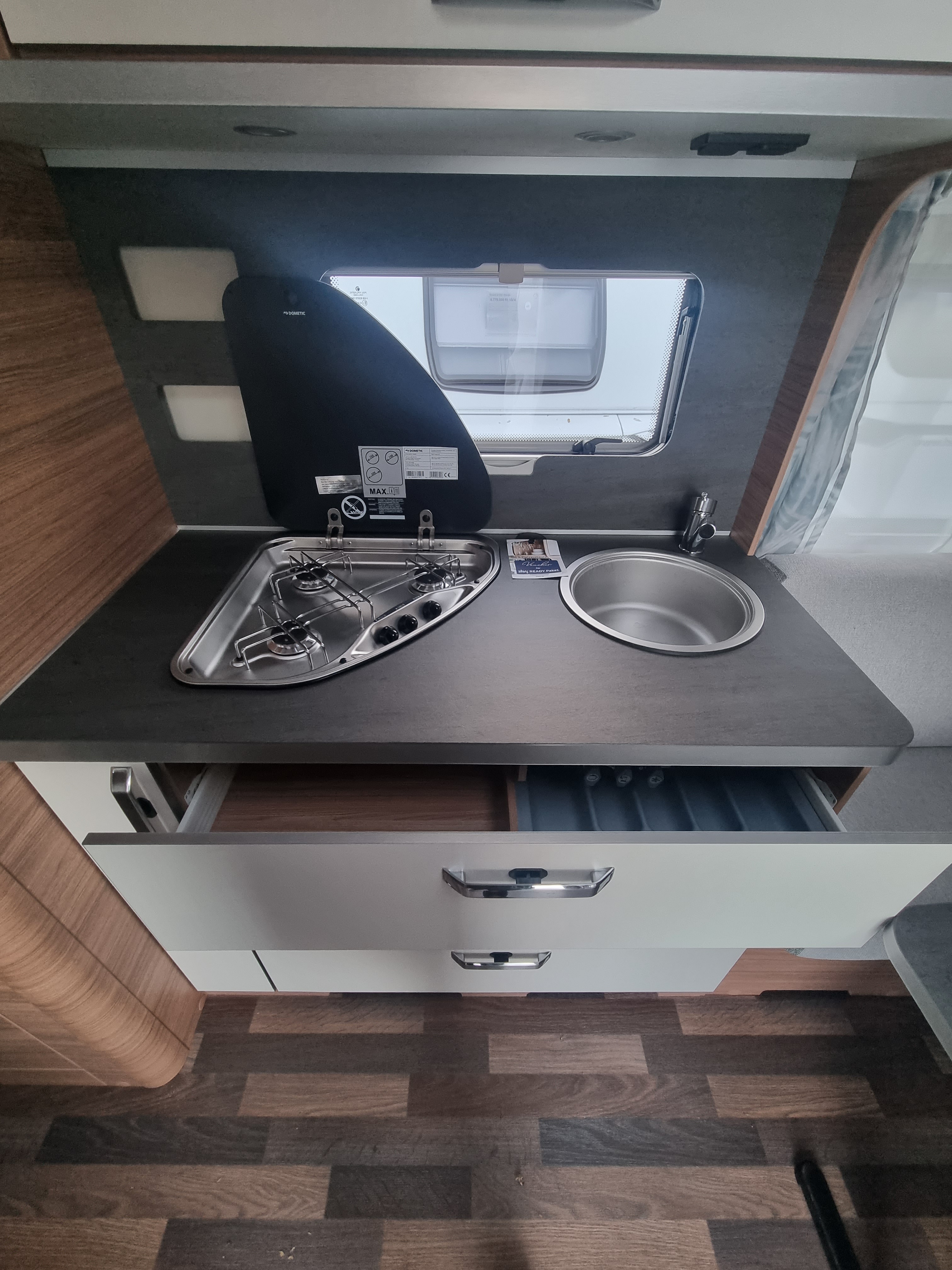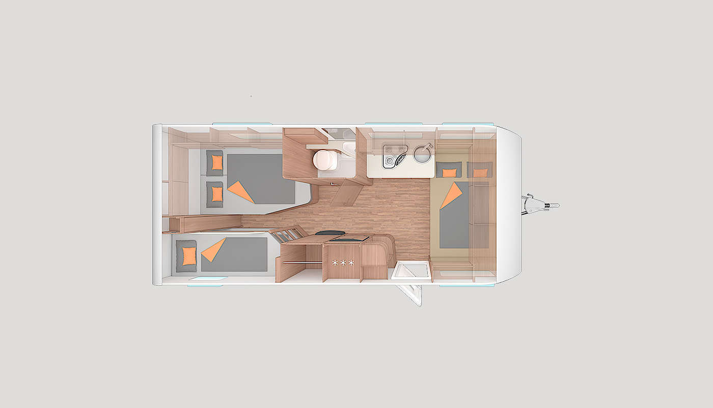 Mosogató, hűtő, tűzhely, 12V-os körfűtés, toronyhűtő, zuhanyfülke zuhanytálcával, beépített mosdóval és bio-Wc-vel, kombiroló, hideg-meleg vízrendszer, 45l-es beépített víztartály, 25l-es mobil szennyvíztartály, panoráma tetőablak, stabilizátoros vonófej, szúnyoghálós ajtó