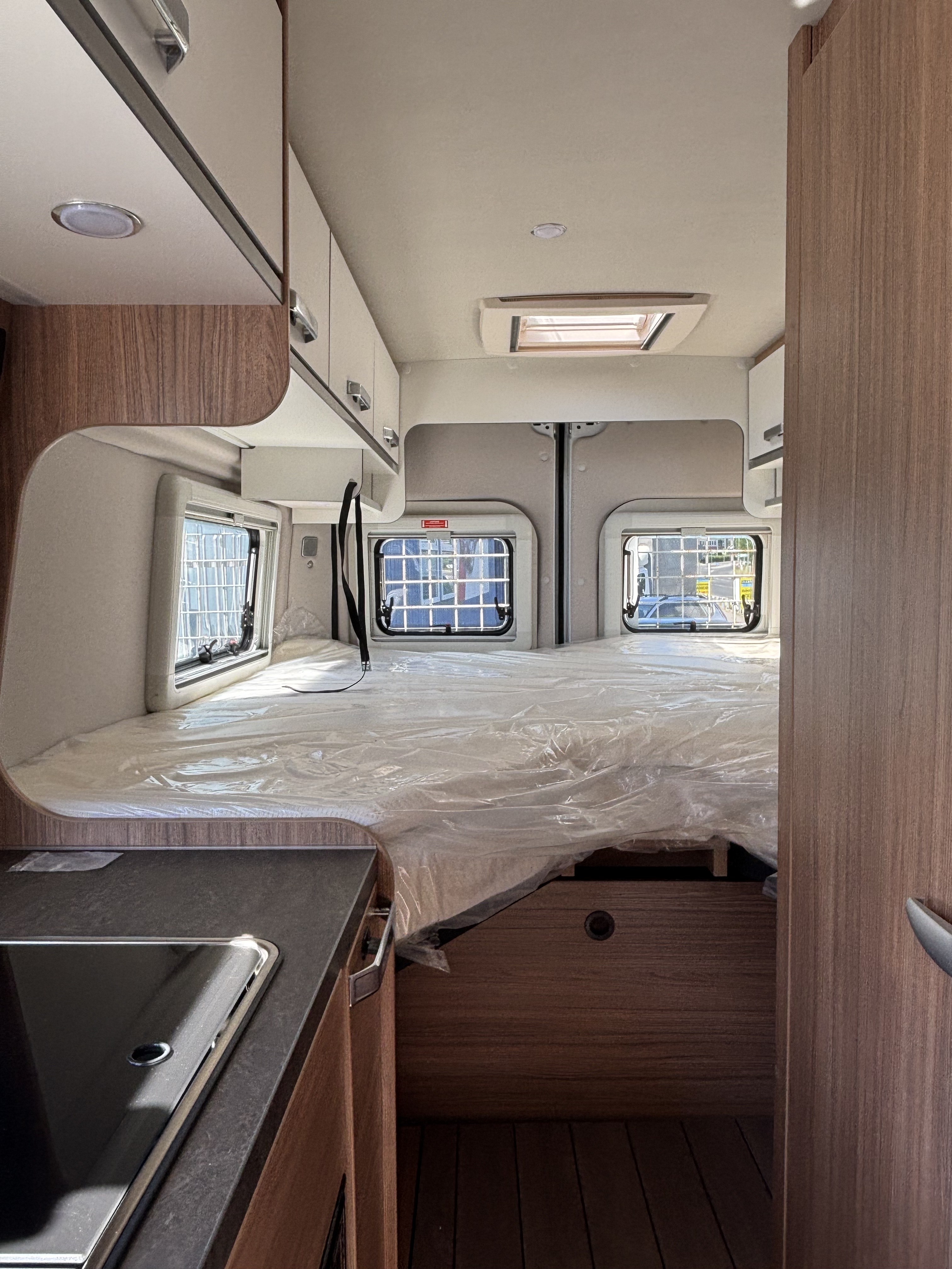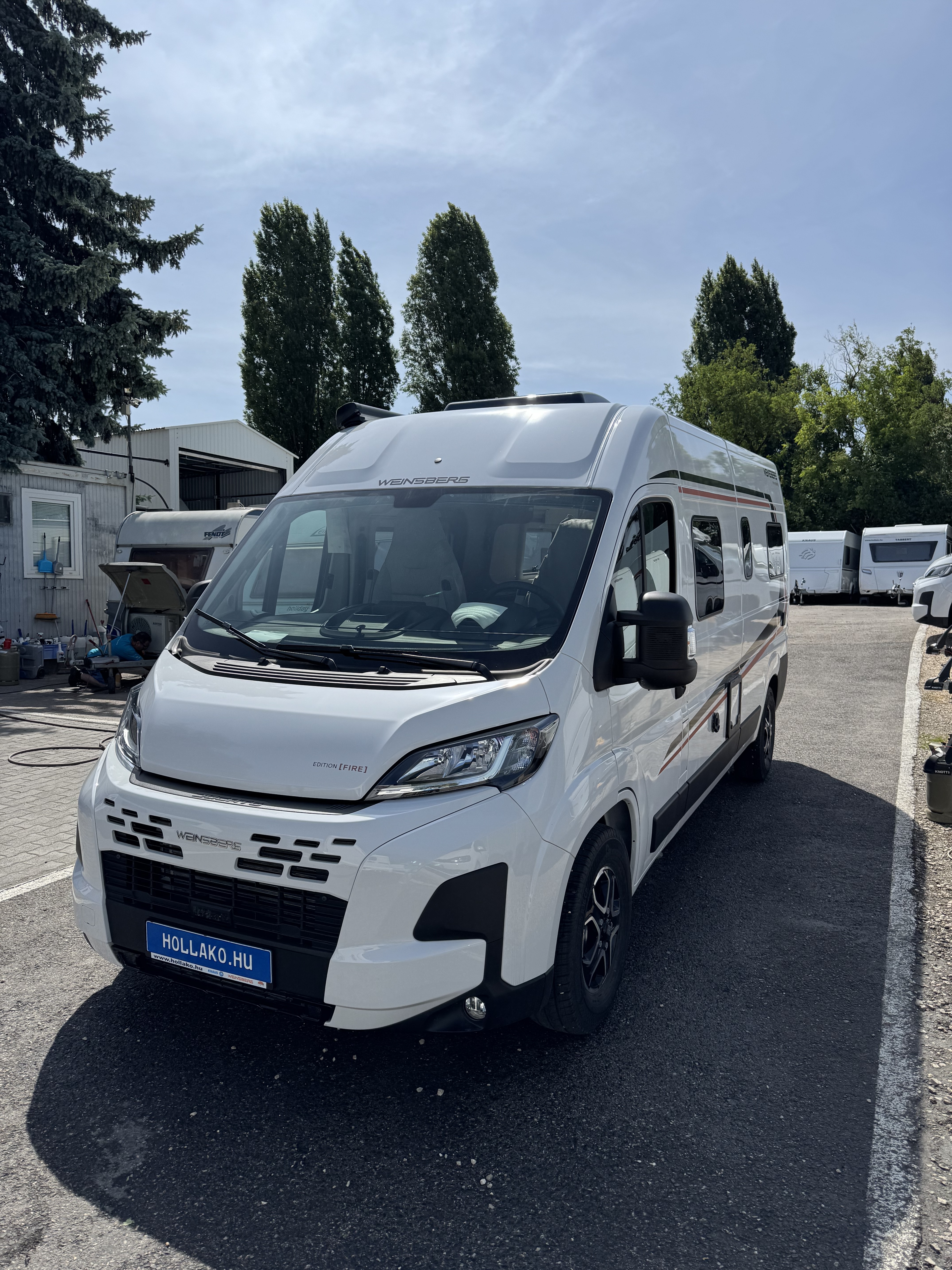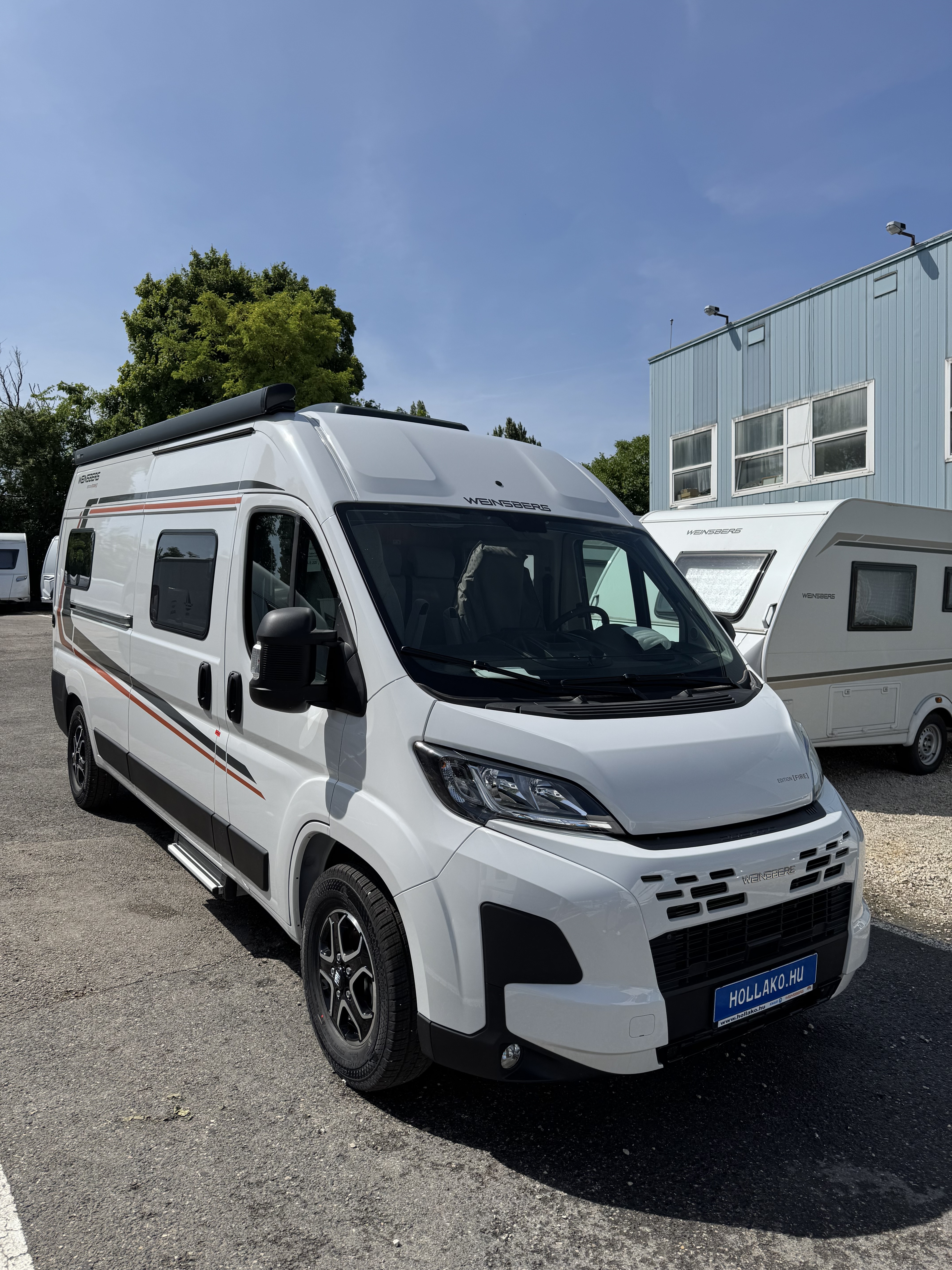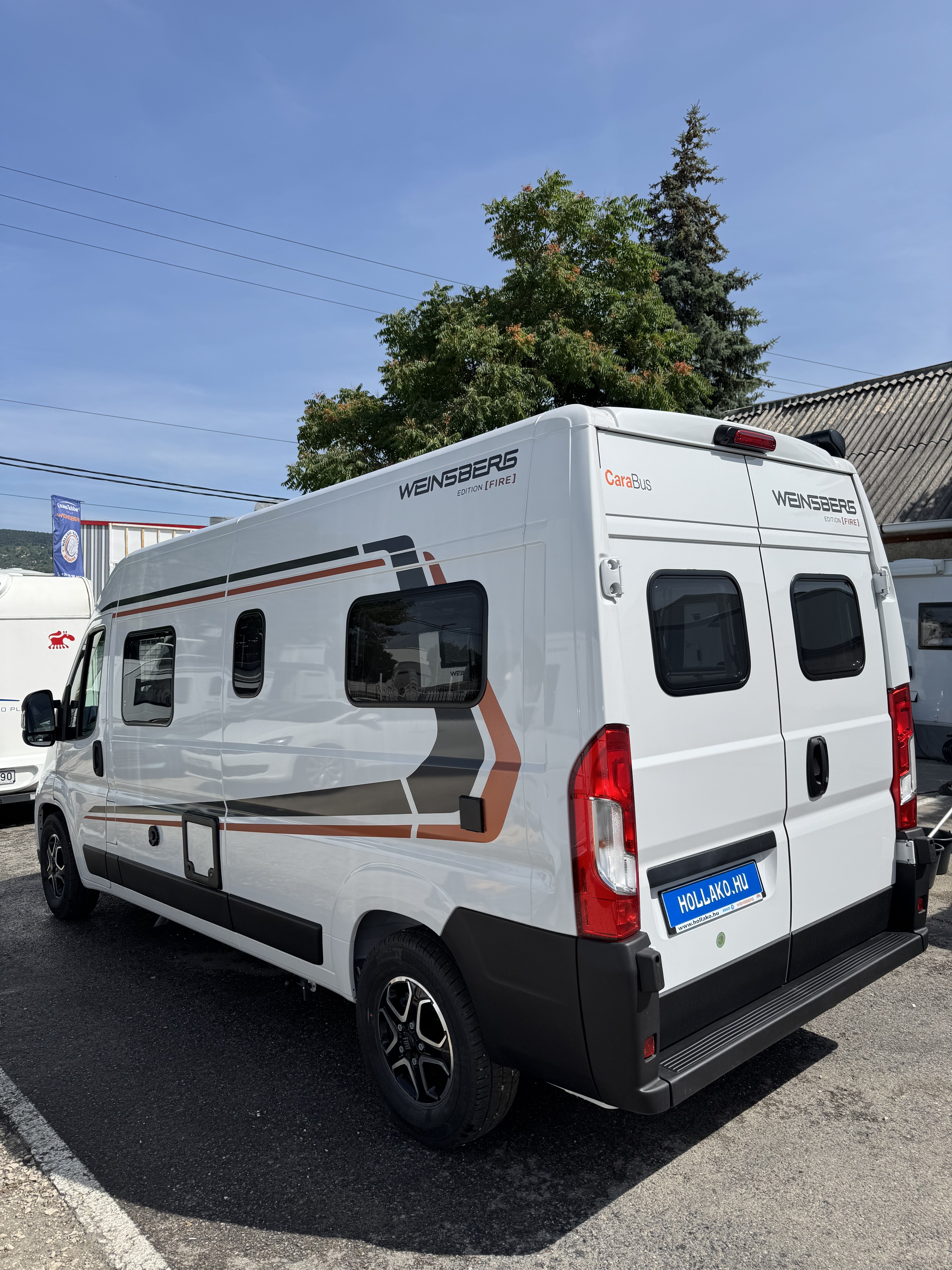 70 cm x 50 cm-es tetőablak, kifelé nyíló ablak (mellékhelyiség), bal oldali kifelé nyíló ablak, jobb oldali kifelé nyíló ablak, keretes ablak, sötétített szélvédő és oldalablak, elektromos fellépő, szúnyoghálós ajtó, tolóajtó feletti esőelvezető LED világítással, speciális Edition Fire matrica, 375 cm x 250 cm omnisztor,