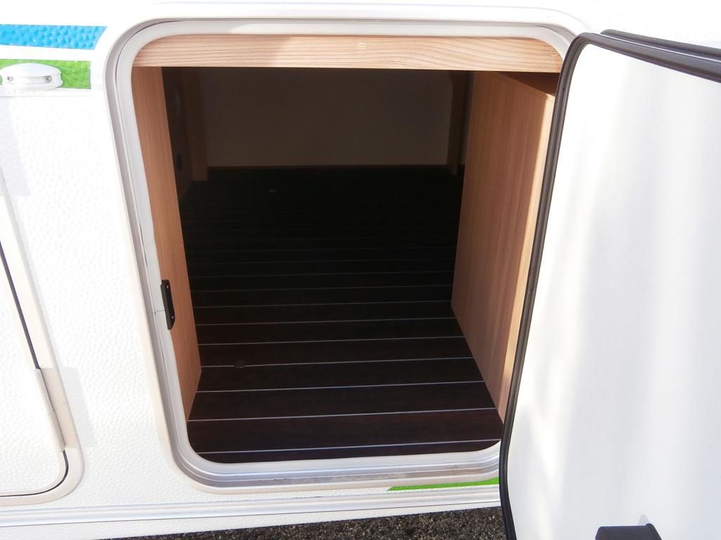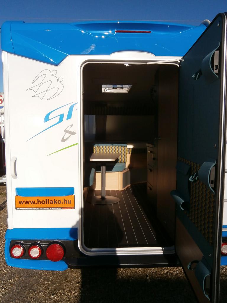 első osztott bejárati ajtó, alsó részén szemetestartóval, hátsó garázsajtó (mérete: 168x88 cm), oldalsó gáztározó (mérete: 63x55 cm), szervizajtó, stabilizátoros vonófej, hátsó létra és csomagtartó sínek a tetőn, francia ágy alatti tároló (mérete sz*h*m: 225x140/167x70 cm)