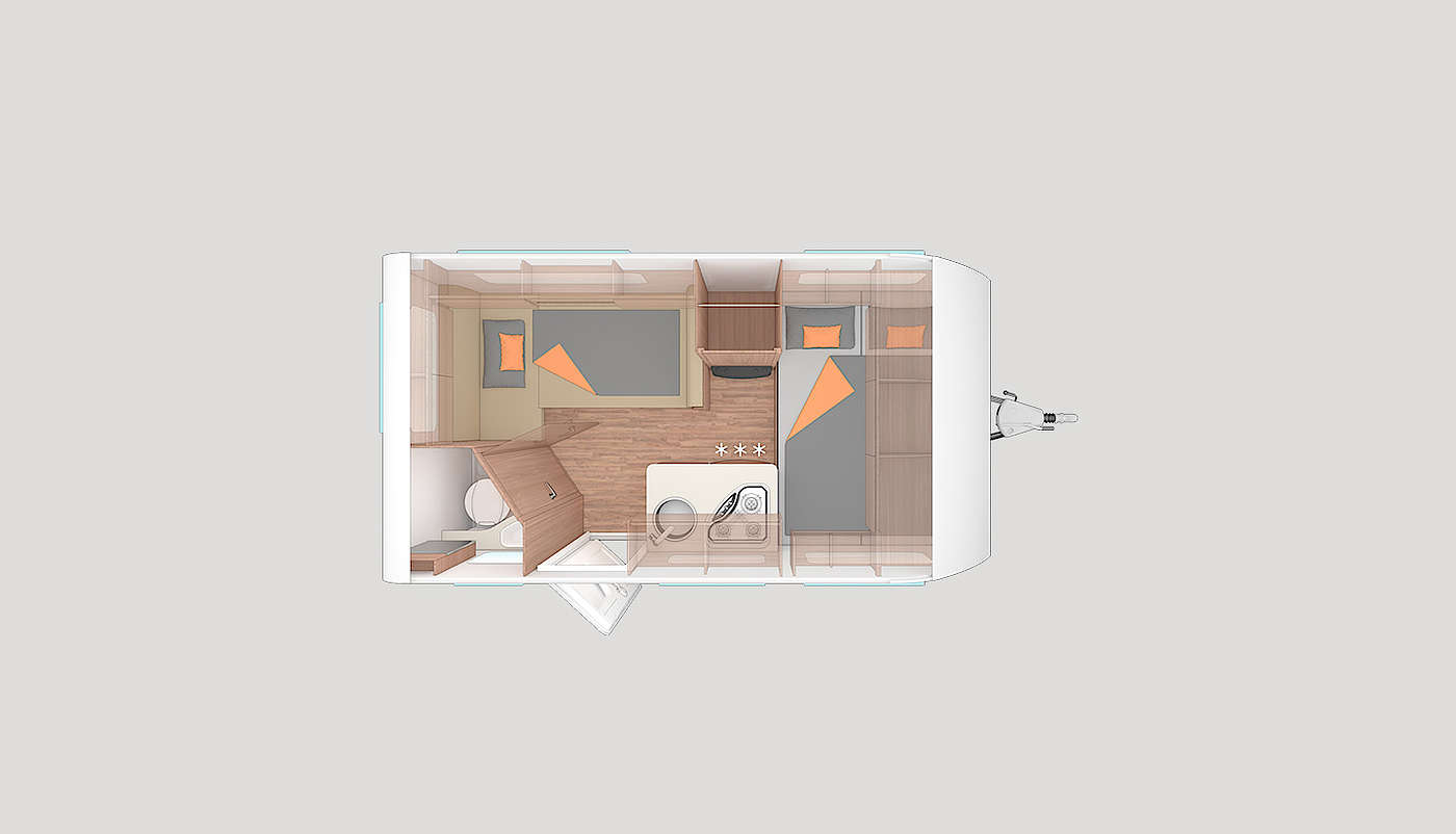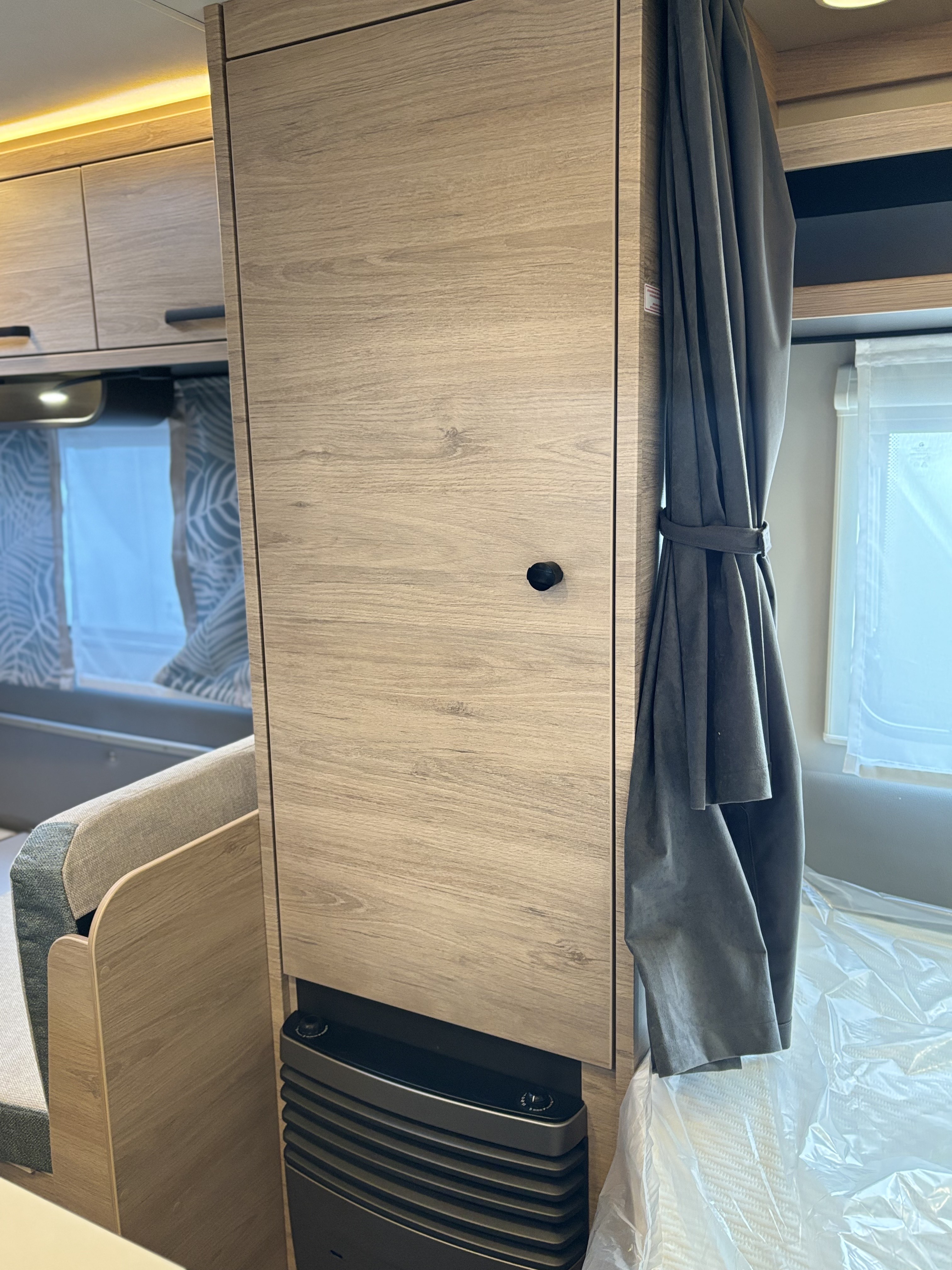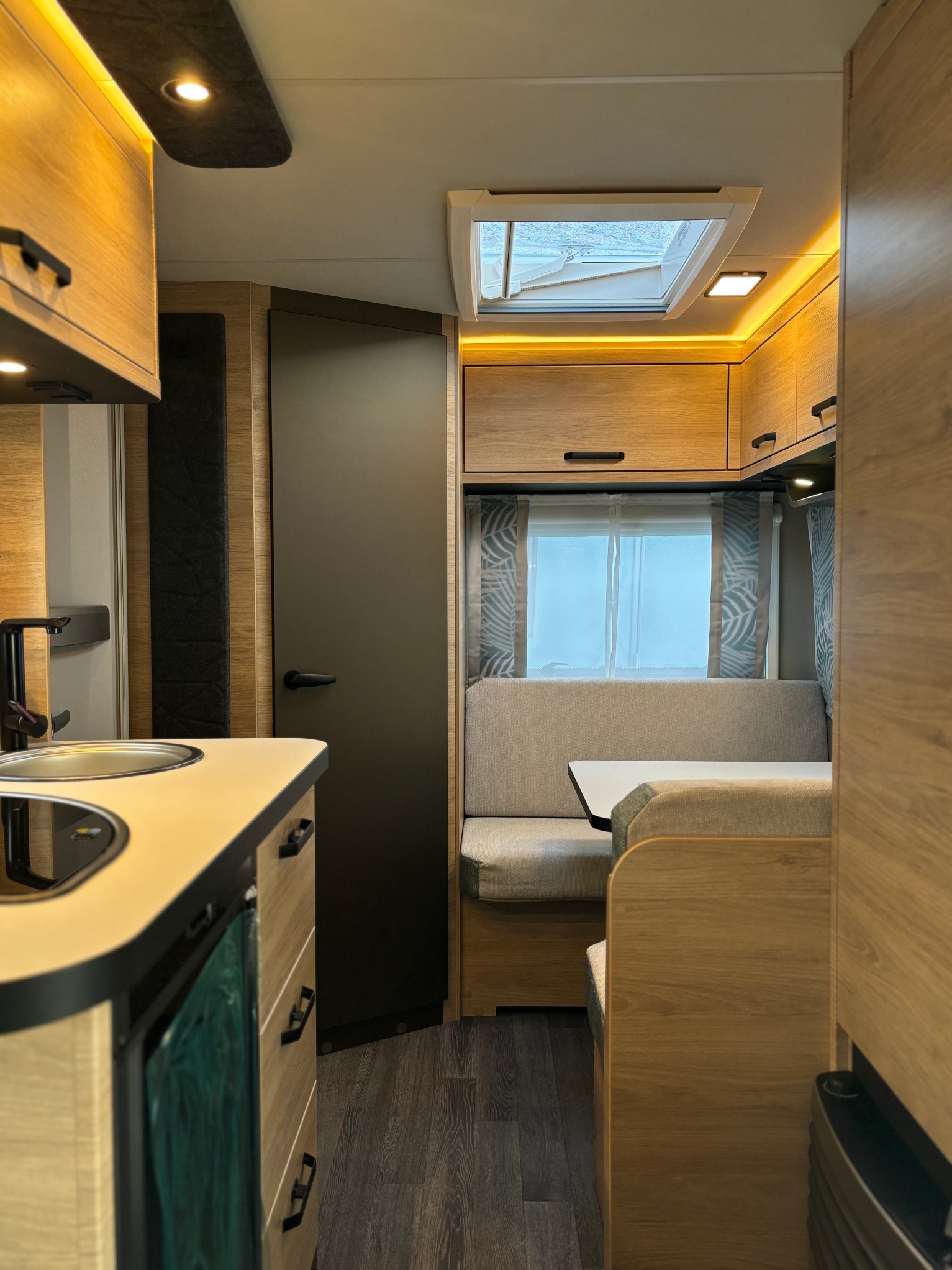 Mosogató, 98 L-es hűtő, 3 égőfejes tűzhely, 12V-os körfűtés, beépített mosdófülke zuhanytálcával és beépített bio-Wc-vel, hideg-meleg vízrendszer, 45 l-es beépített víztartály, 25l-es mobil szennyvíztartály, 28 cm x 28 cm panoráma tetőablak, kombirolók, EvoPore HRC matrac, Truma S 3004 gázfűtés