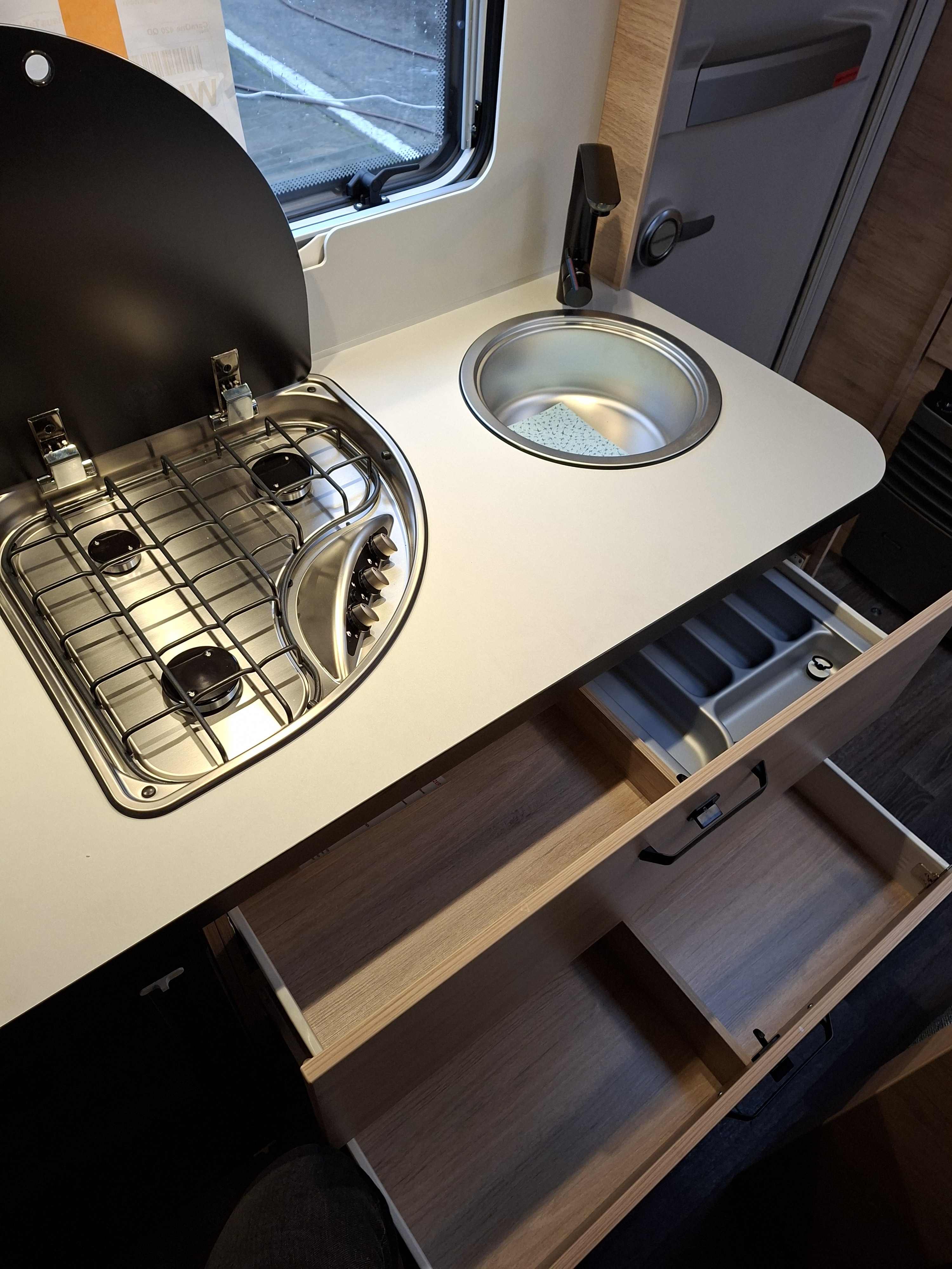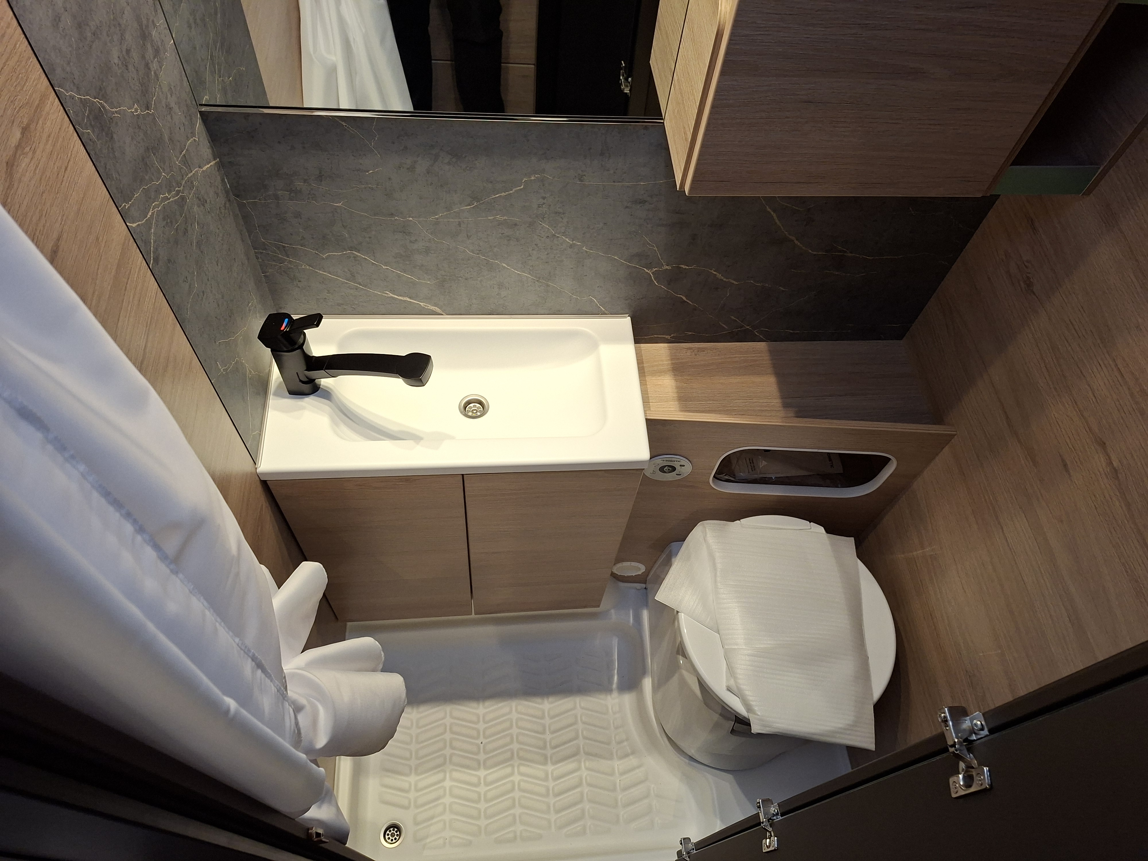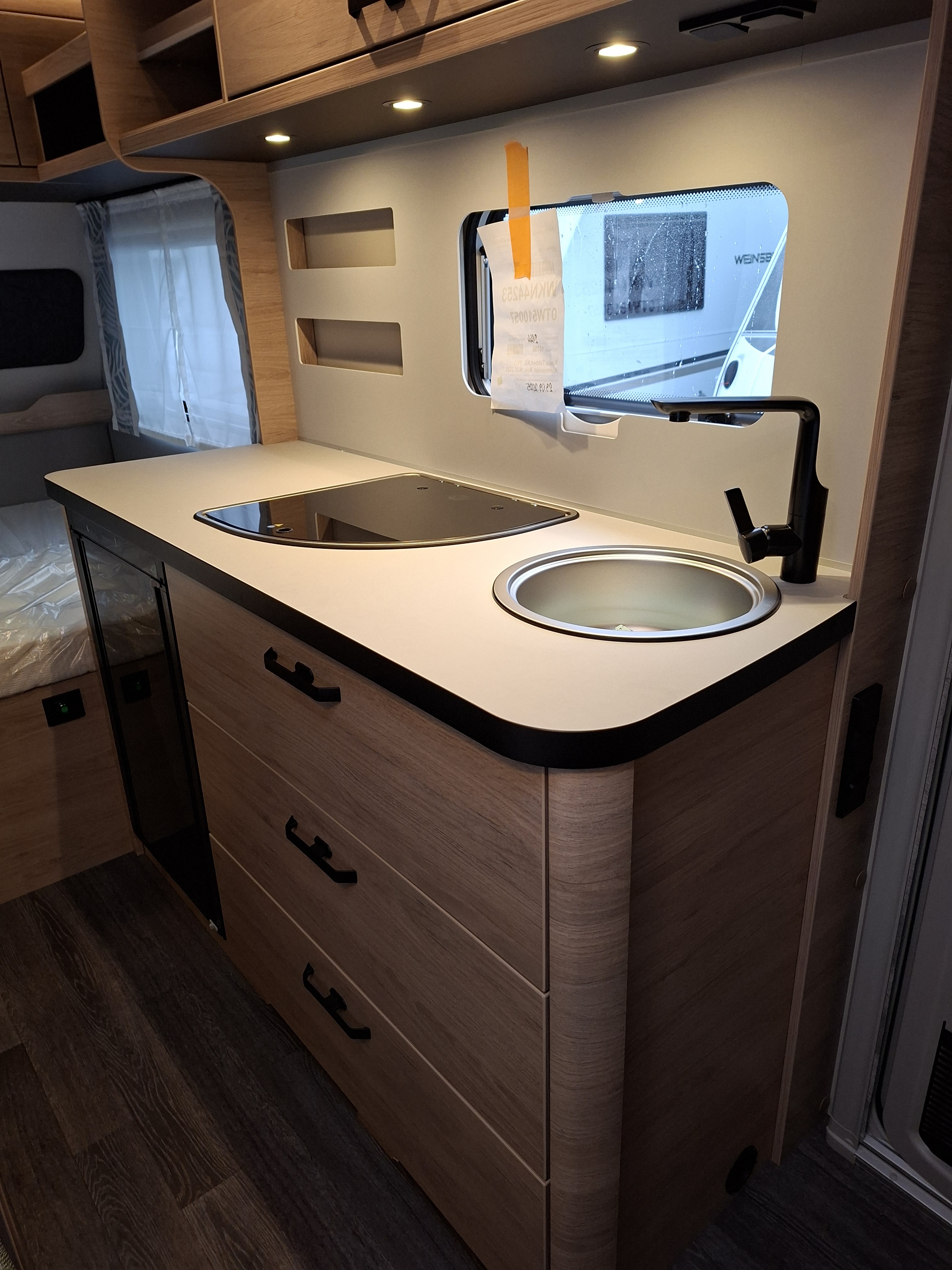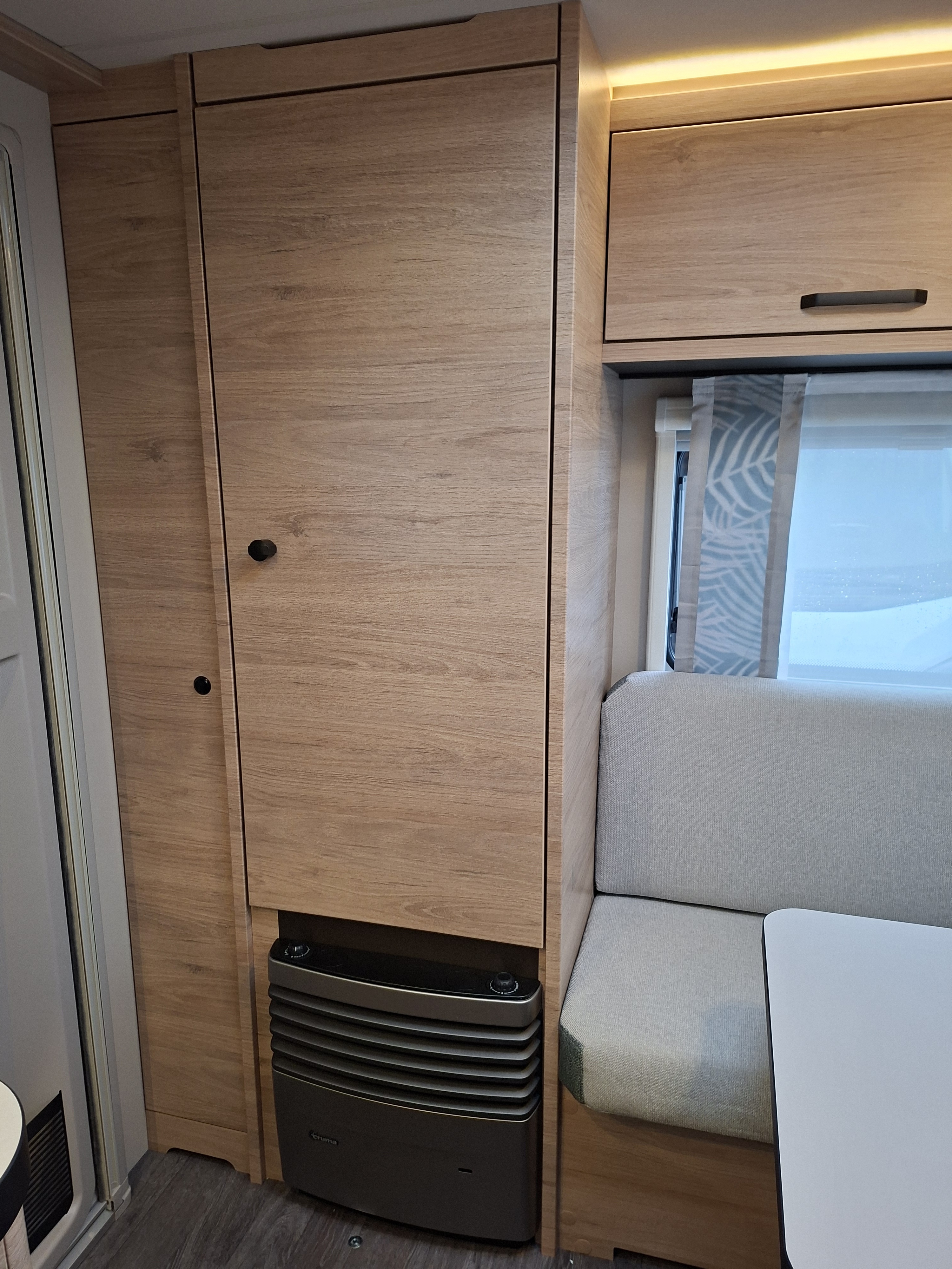 Mosogató, hűtő, tűzhely, 12V-os körfűtés, beépített mosdófülke zuhanytálcával és beépített bio wc-vel, kombirolók, szúnyoghálós ajtó, hideg-meleg vízrendszer, 45l-es beépített víztartály, 25l-es mobil szennyvíztartály, panoráma tetőablak, stabilizátoros vonófej