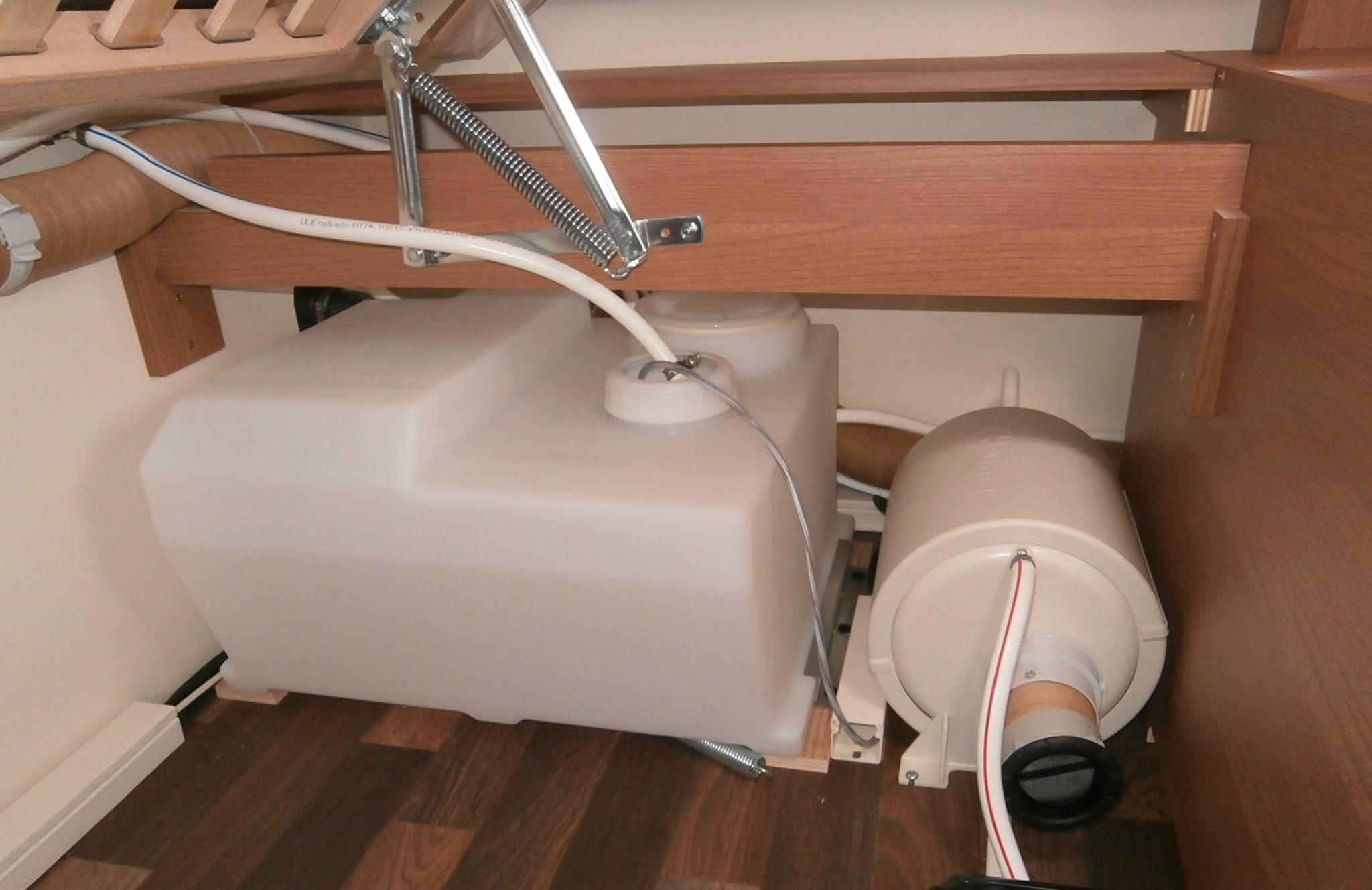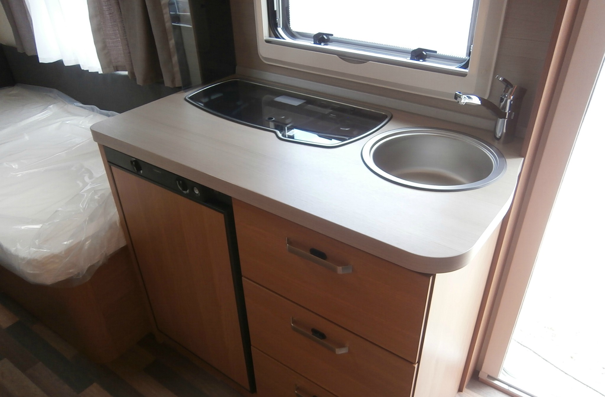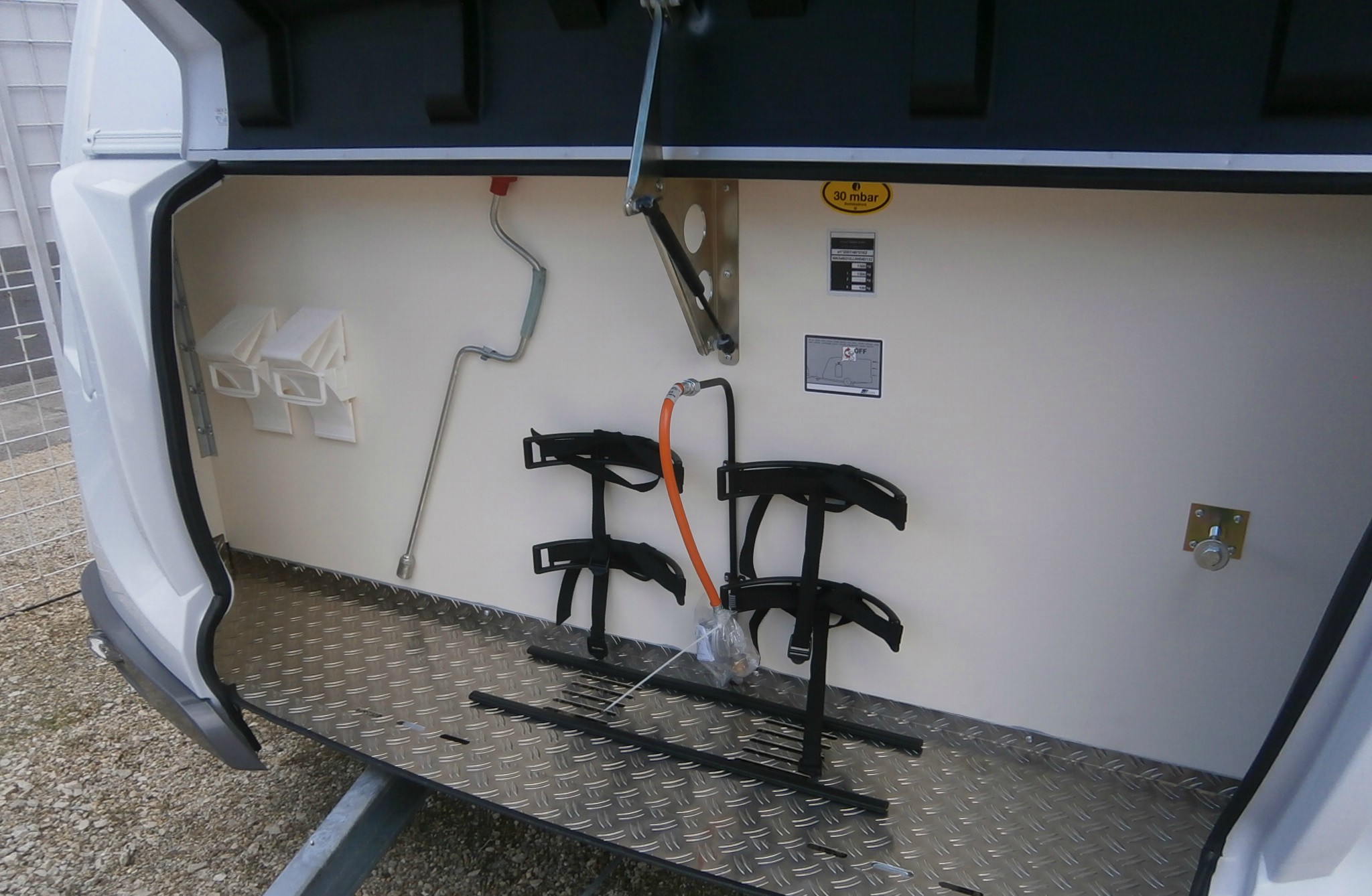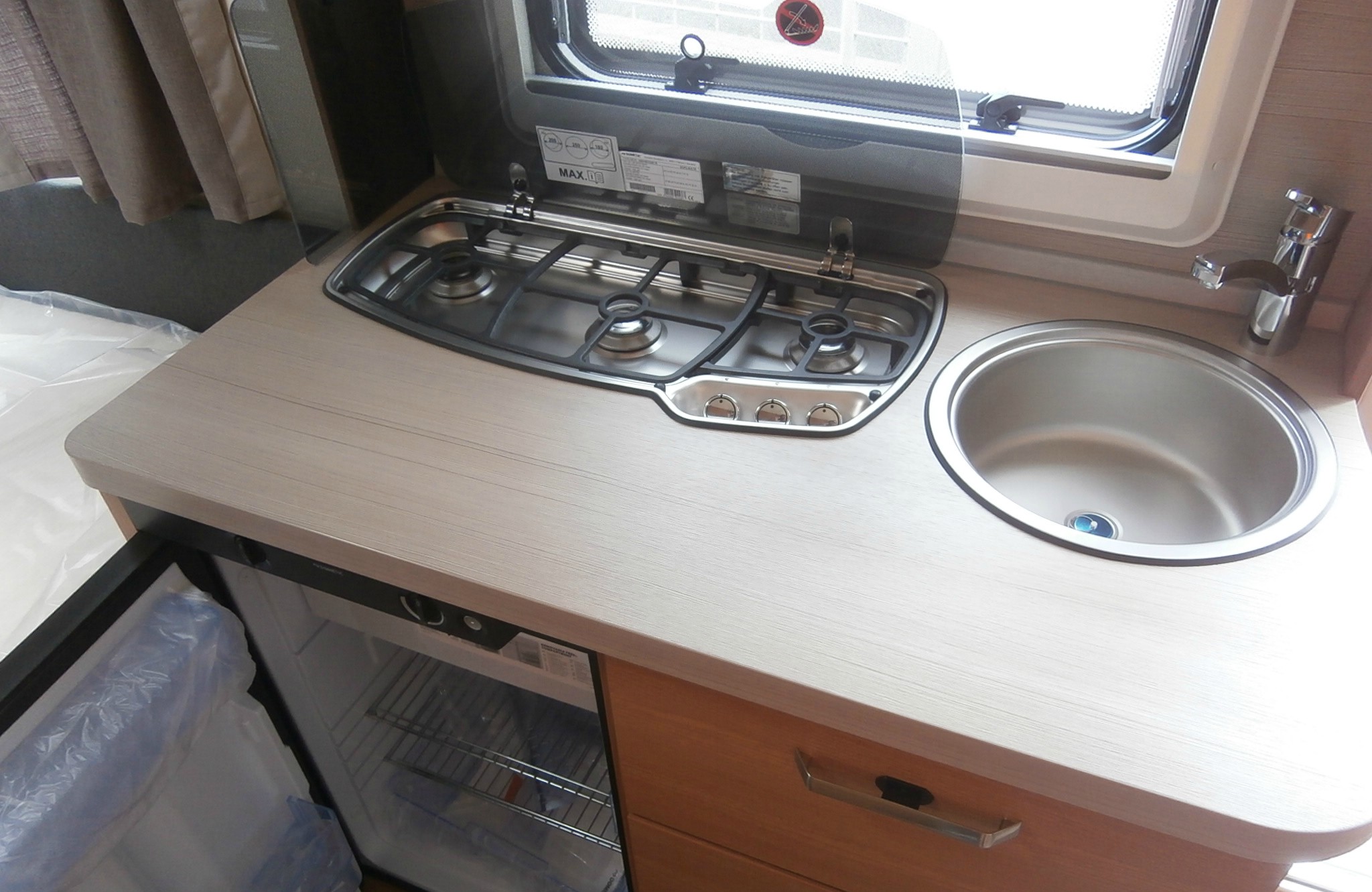 Mosogató, hűtő, tűzhely, 12V-os körfűtés, zuhanyfülke mosdóval és beépített bio Wc-vel, hideg-meleg vízrendszer, 45l-es beépített víztartály, szervizajtó, kombirolók, szúnyoghálós ajtó,