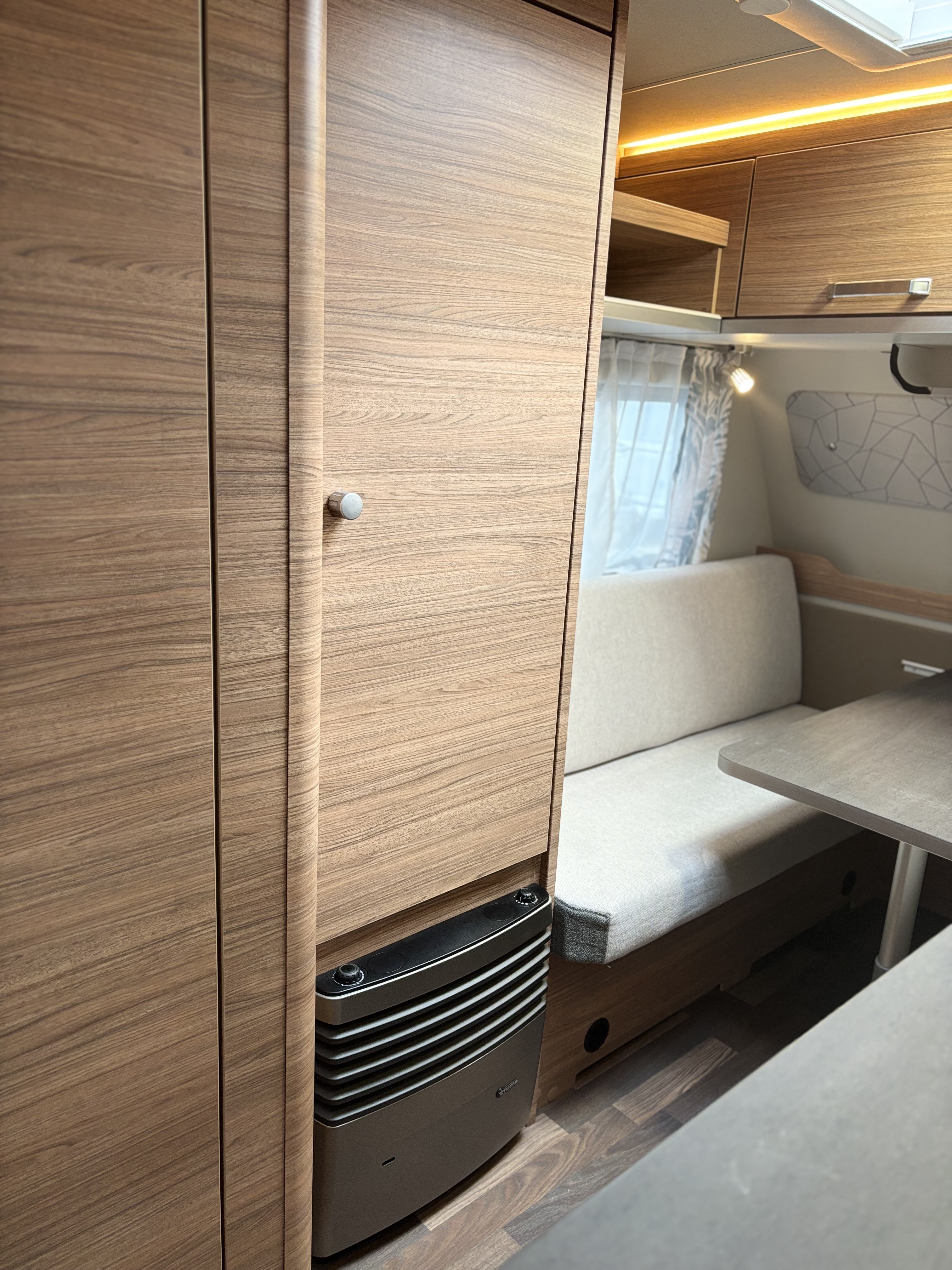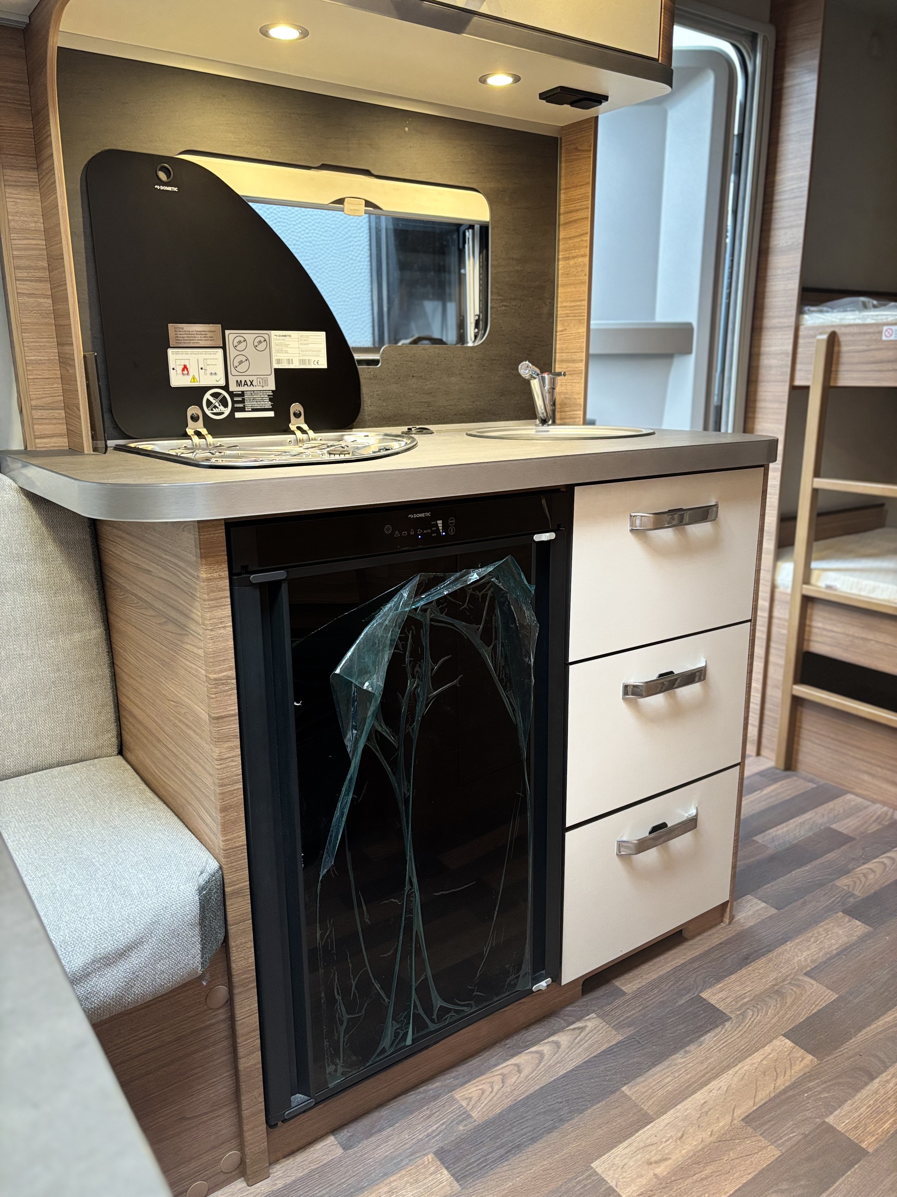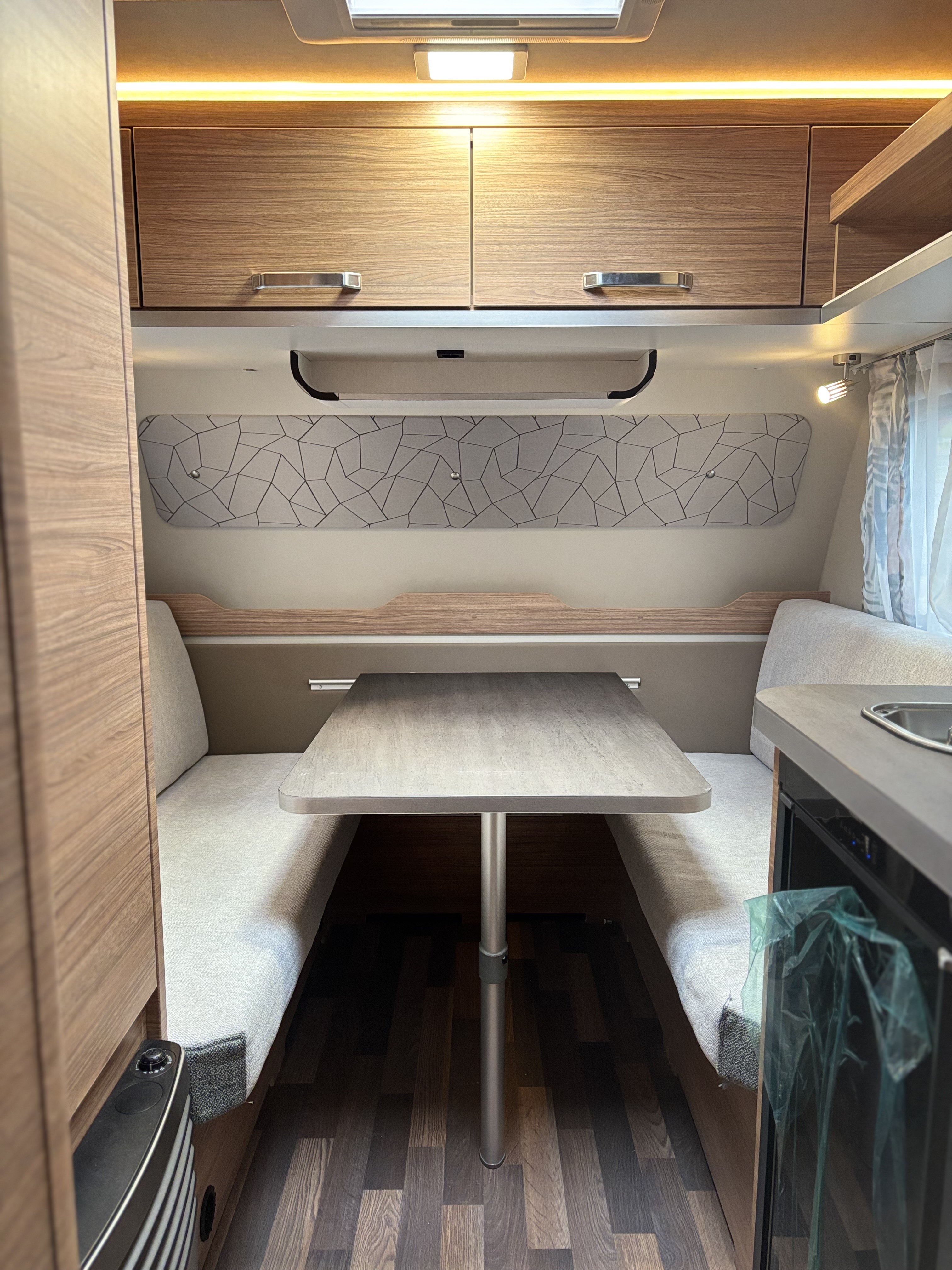 Mosogató, hűtő, tűzhely, 12V-os körfűtés, beépített mosdófülke zuhanytálcával és beépített bio-Wc-vel, kombirolók, szúnyoghálós ajtó, hideg-meleg vízrendszer, 45 l-es beépített víztartály, 25l-es mobil szennyvíztartály, panoráma tetőablak, stabilizátoros vonófej