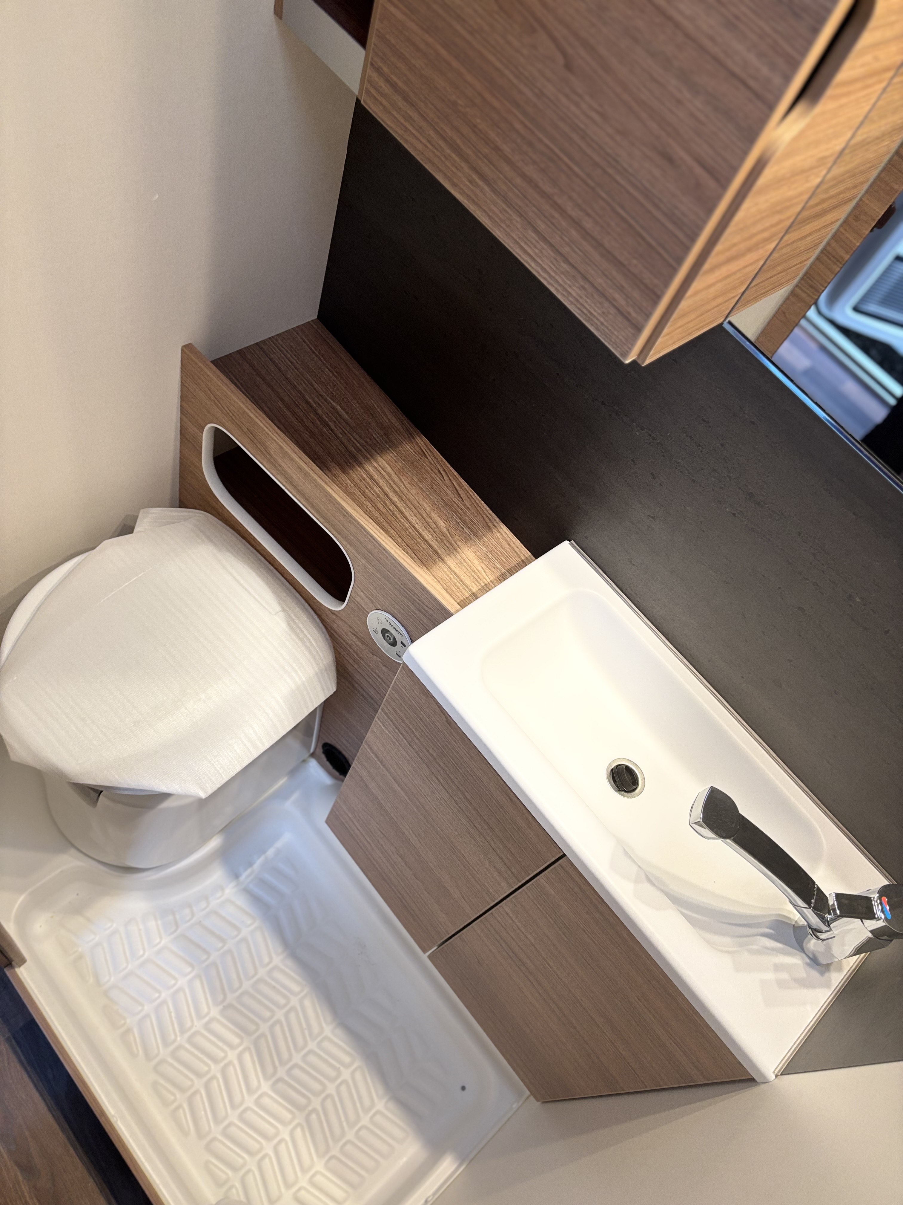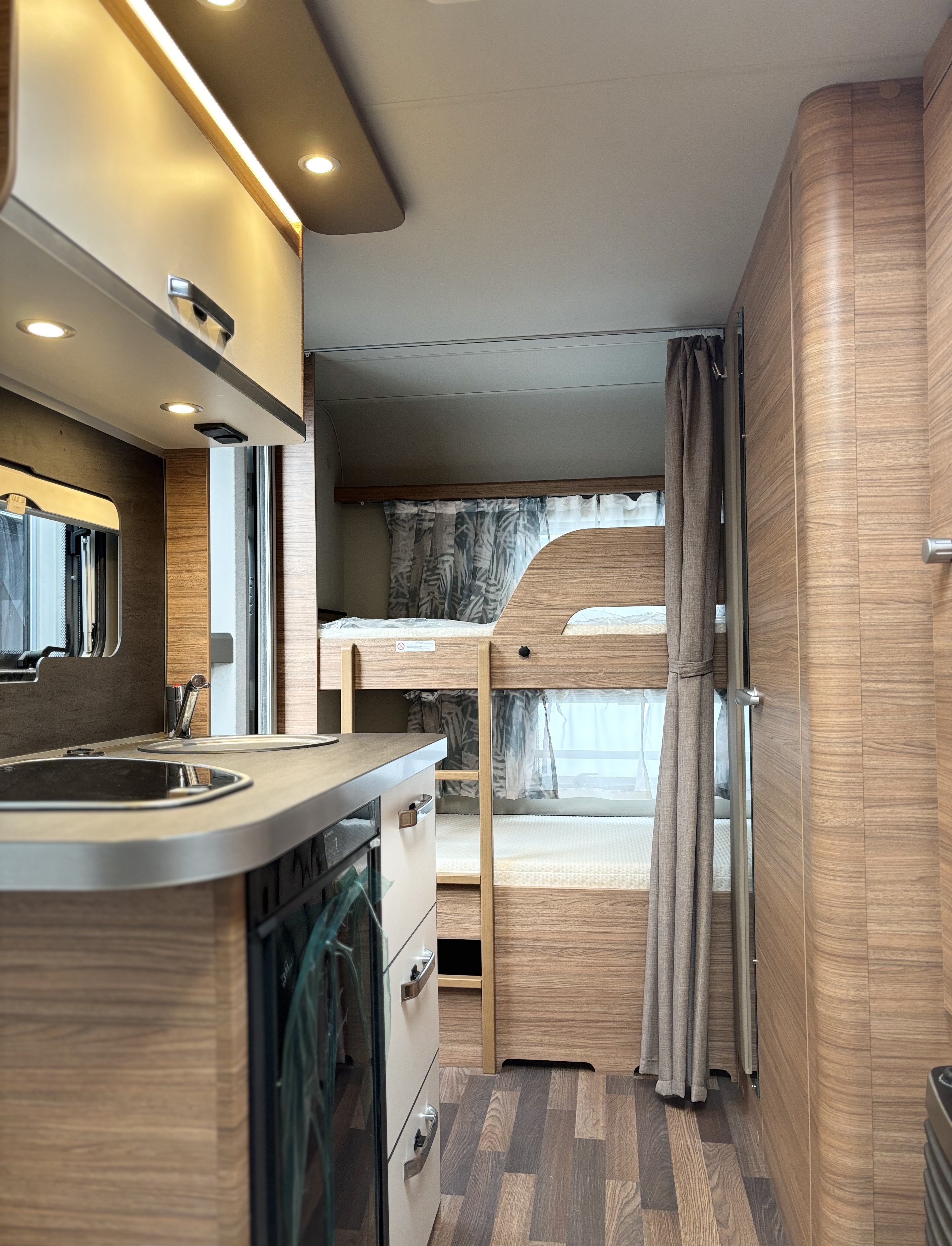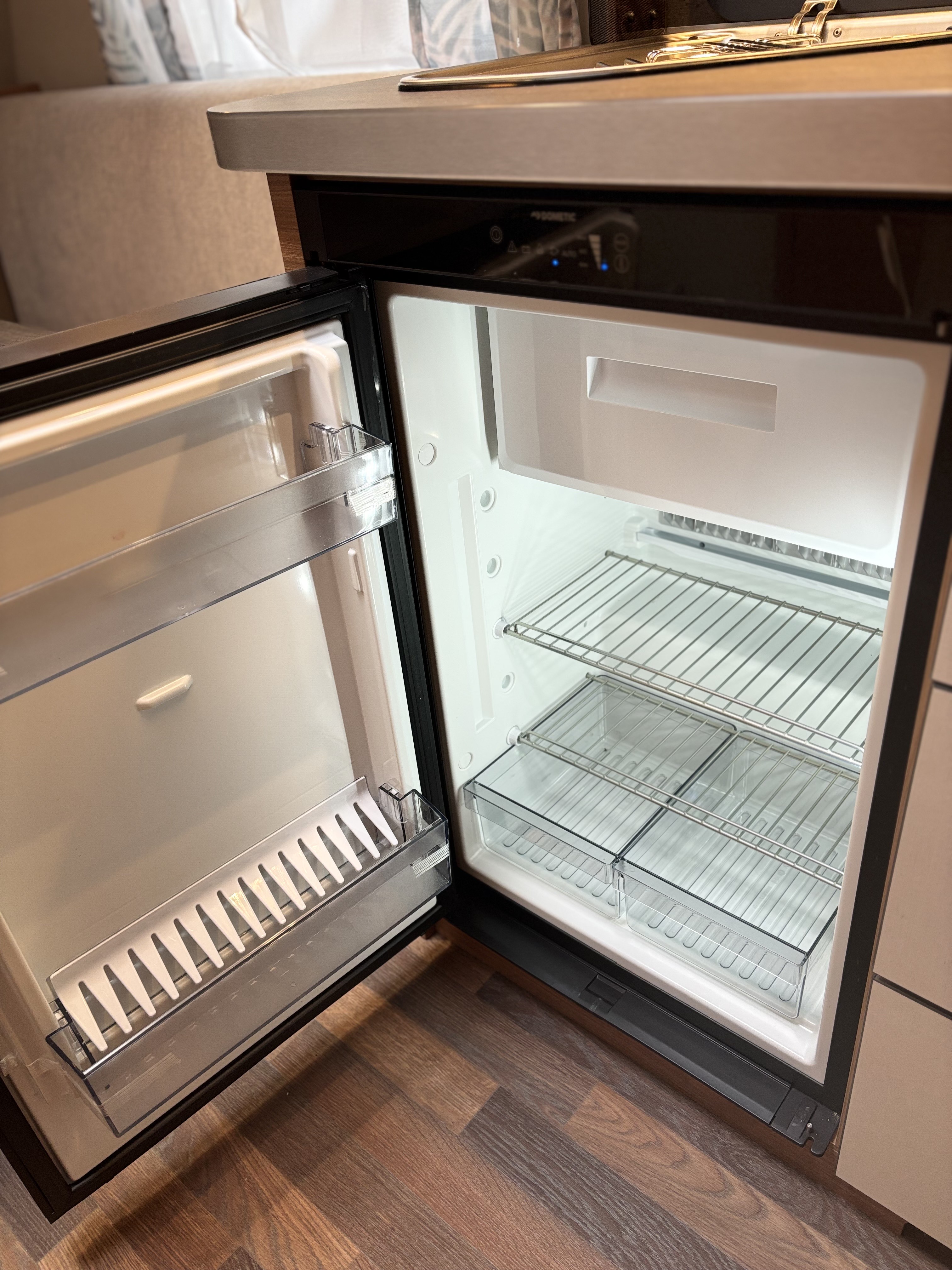 Mosogató, hűtő, tűzhely, 12V-os körfűtés, beépített mosdófülke zuhanytálcával és beépített bio-Wc-vel, kombirolók, szúnyoghálós ajtó, hideg-meleg vízrendszer, 45 l-es beépített víztartály, 25l-es mobil szennyvíztartály, panoráma tetőablak, stabilizátoros vonófej