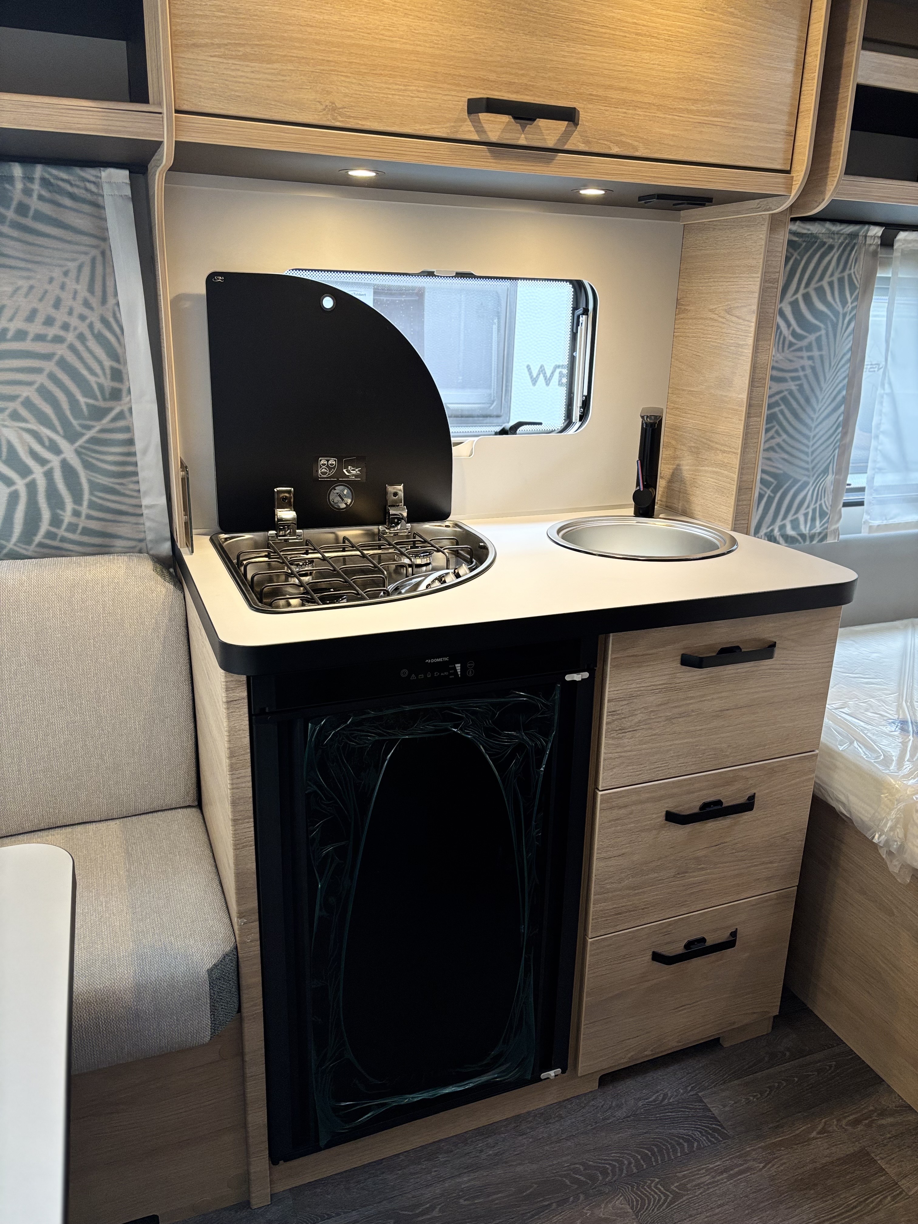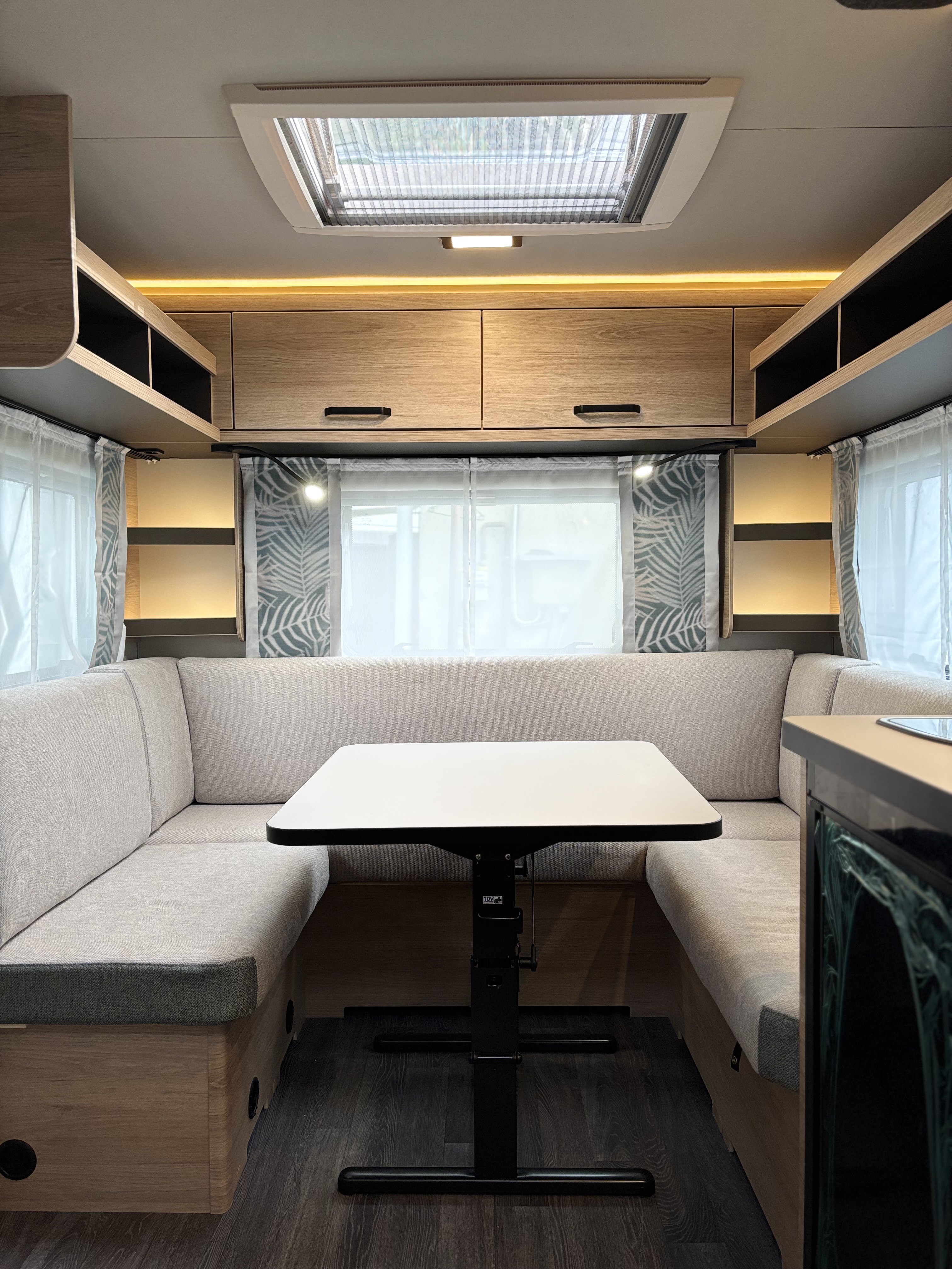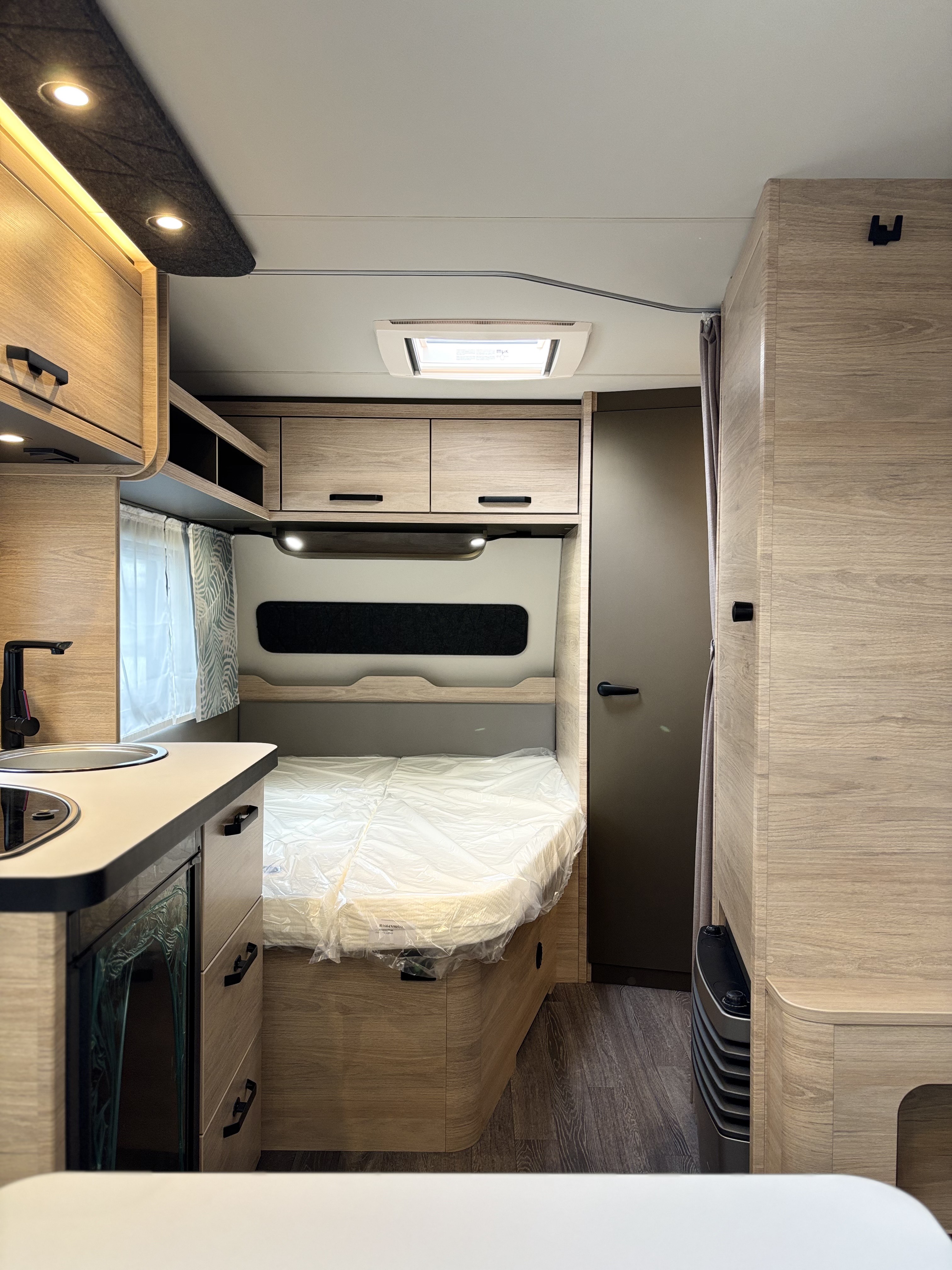Mosogató, Dometic 98 L-es hűtő, 3 égőfejes tűzhely, mosdófülke zuhanytálcával és beépített bio-Wc-vel, kombirolók, hideg-melegvíz rendszer, 45l-es beépített víztartály, 25l-es mobil szennyvíztartály, 40x40 cm-es panoráma tetőablak, EvoPore HRC matrac, Forest kárpitozás, olvasólámpa, gardróbszekrény, Truma gázfűtés S 3004,