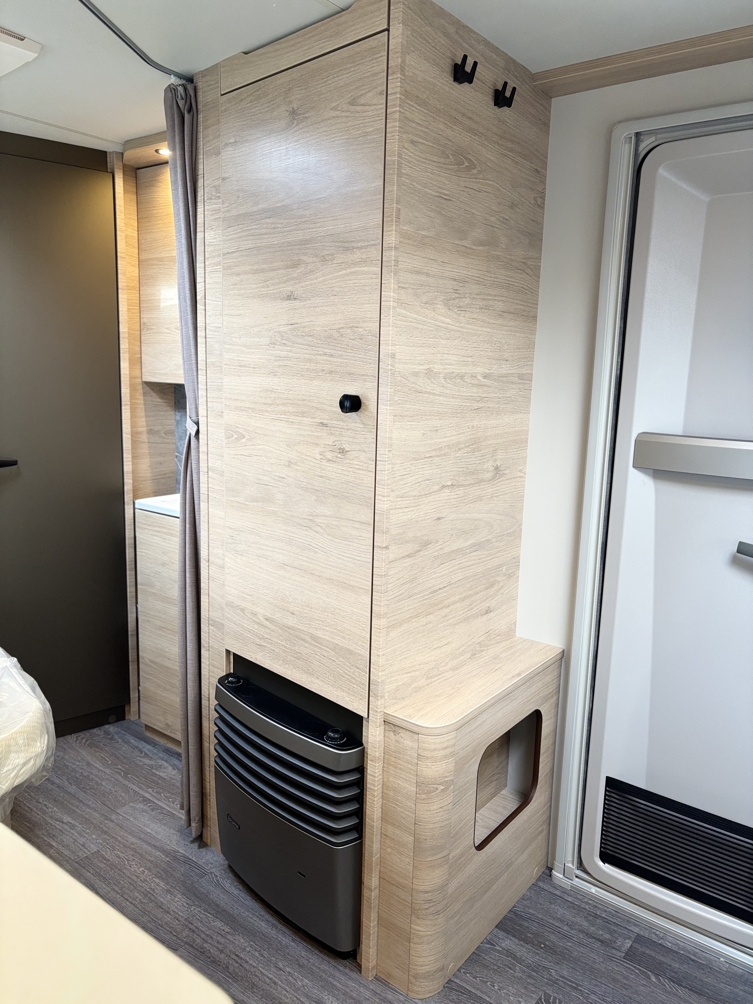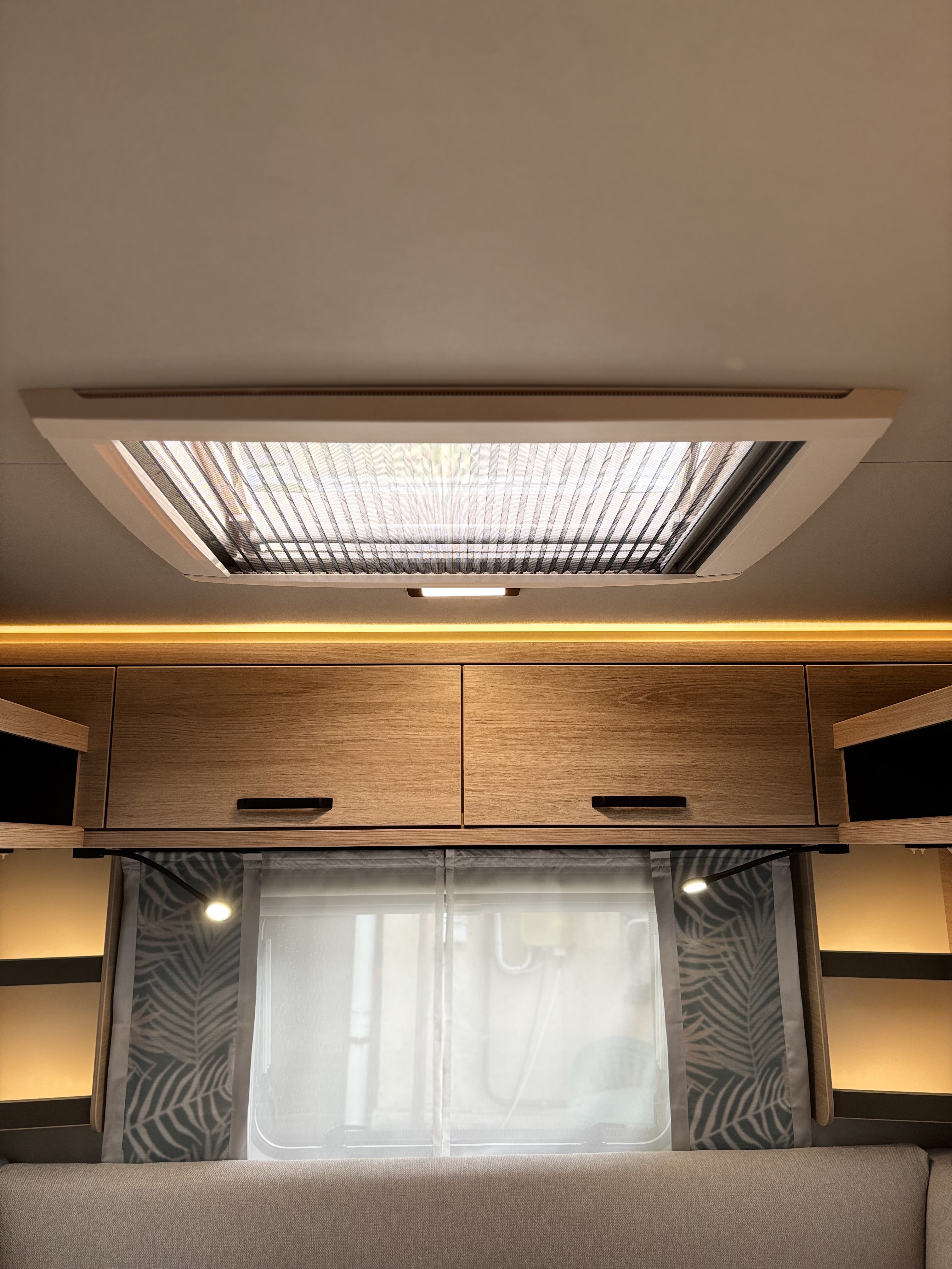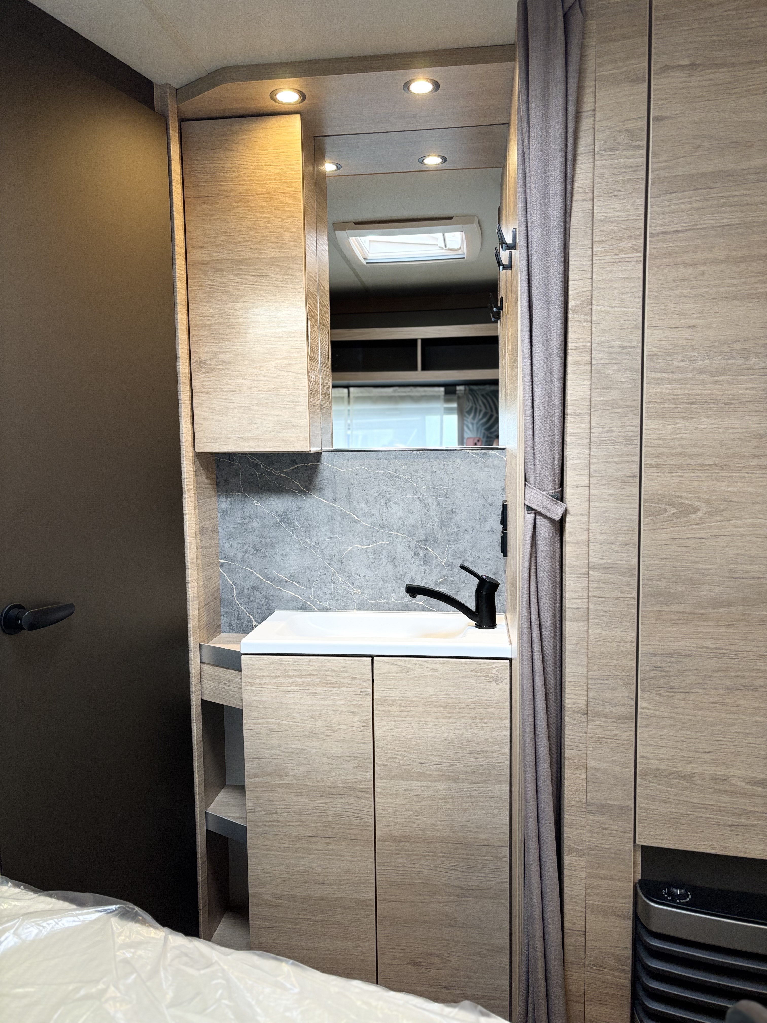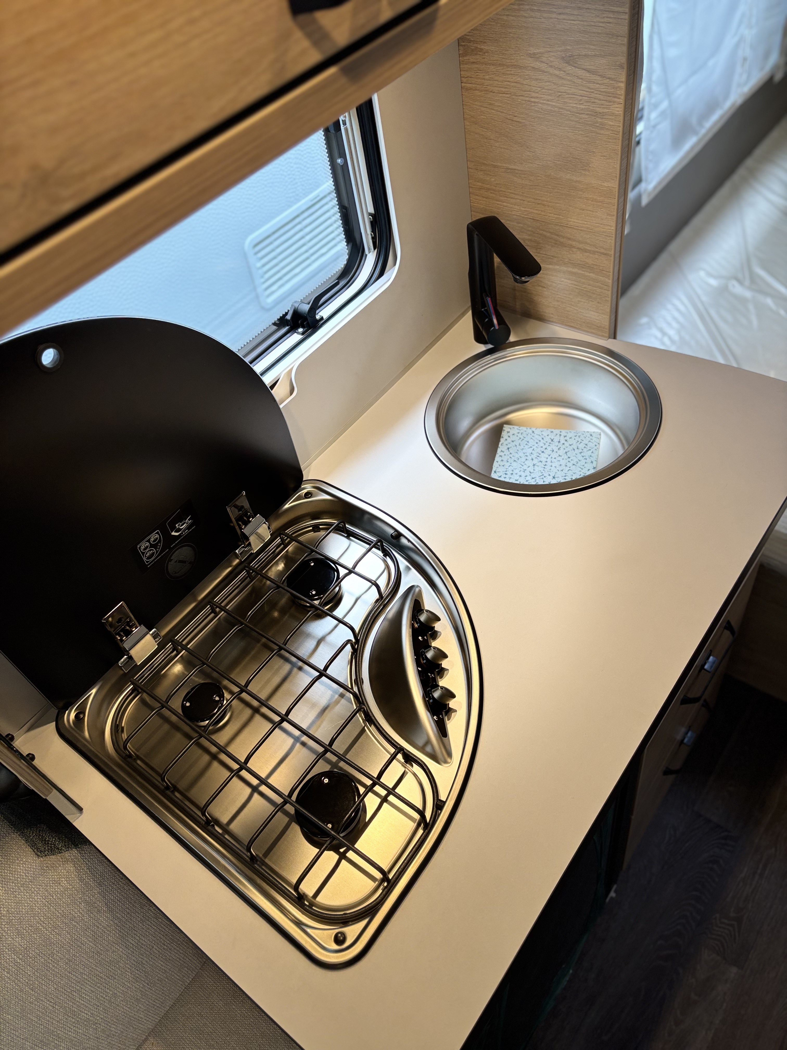 Mosogató, Dometic 98 L-es hűtő, 3 égőfejes tűzhely, mosdófülke zuhanytálcával és beépített bio-Wc-vel, kombirolók, hideg-melegvíz rendszer, 45l-es beépített víztartály, 25l-es mobil szennyvíztartály, 40x40 cm-es panoráma tetőablak, EvoPore HRC matrac, Forest kárpitozás, olvasólámpa, gardróbszekrény, Truma gázfűtés S 3004,
