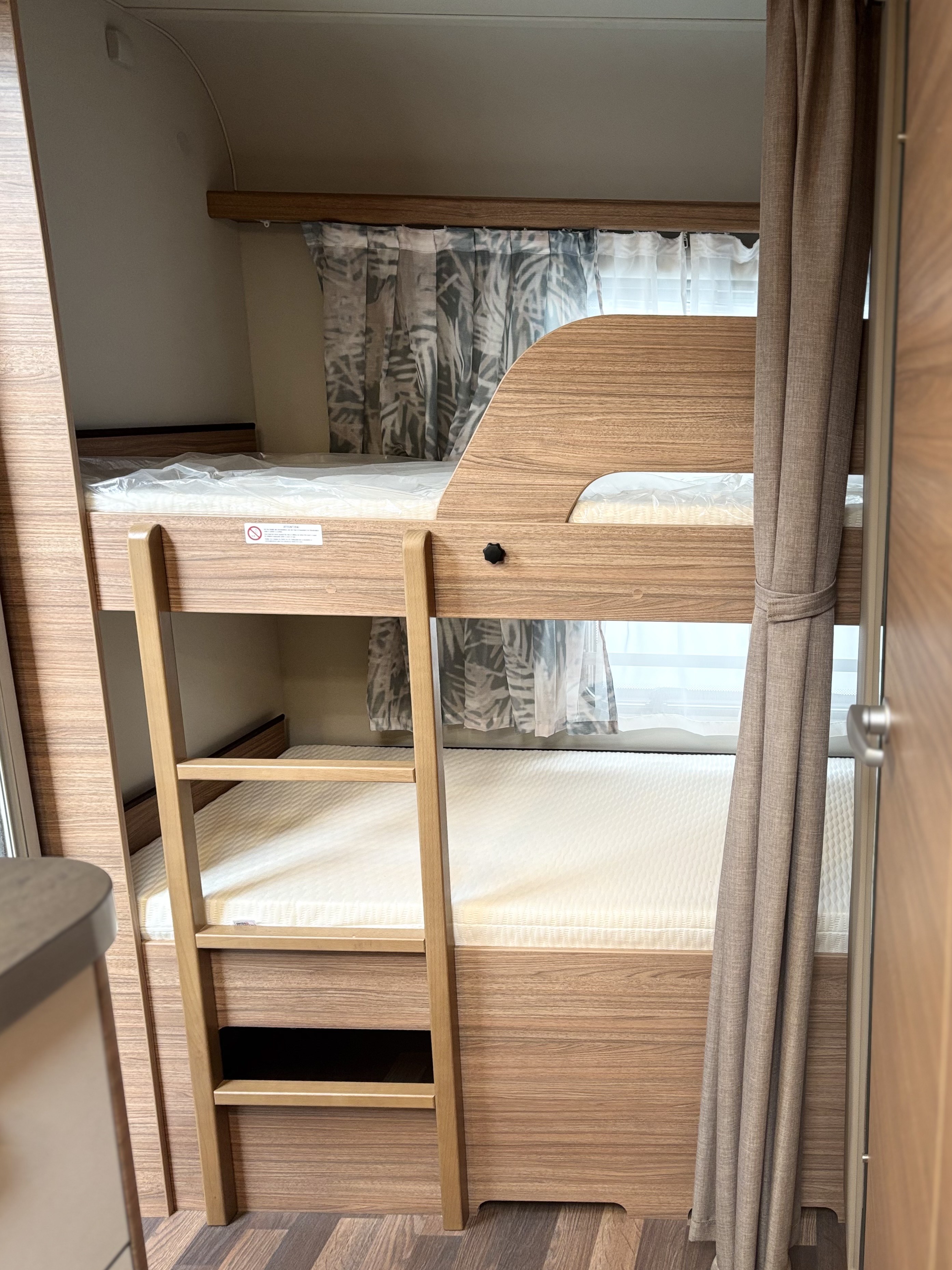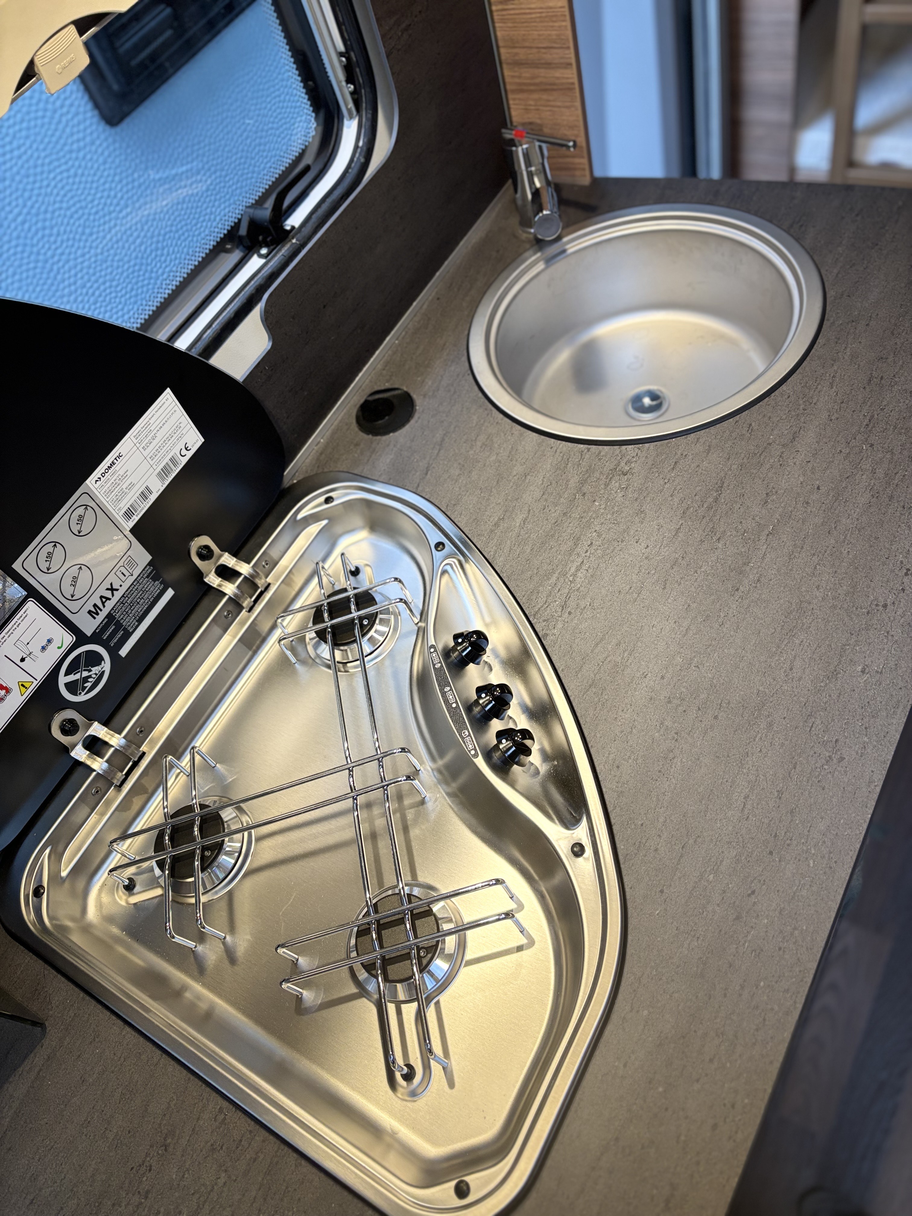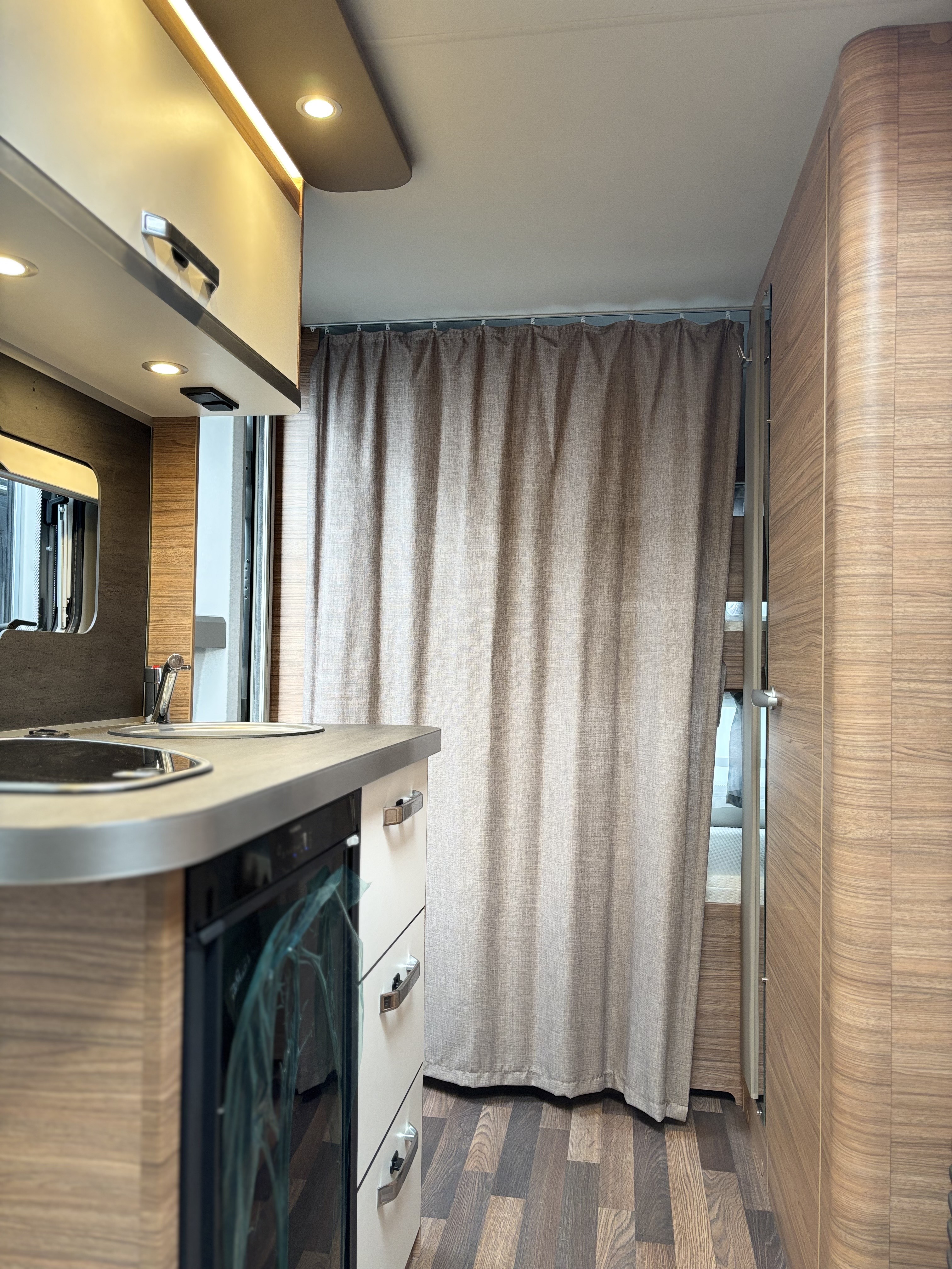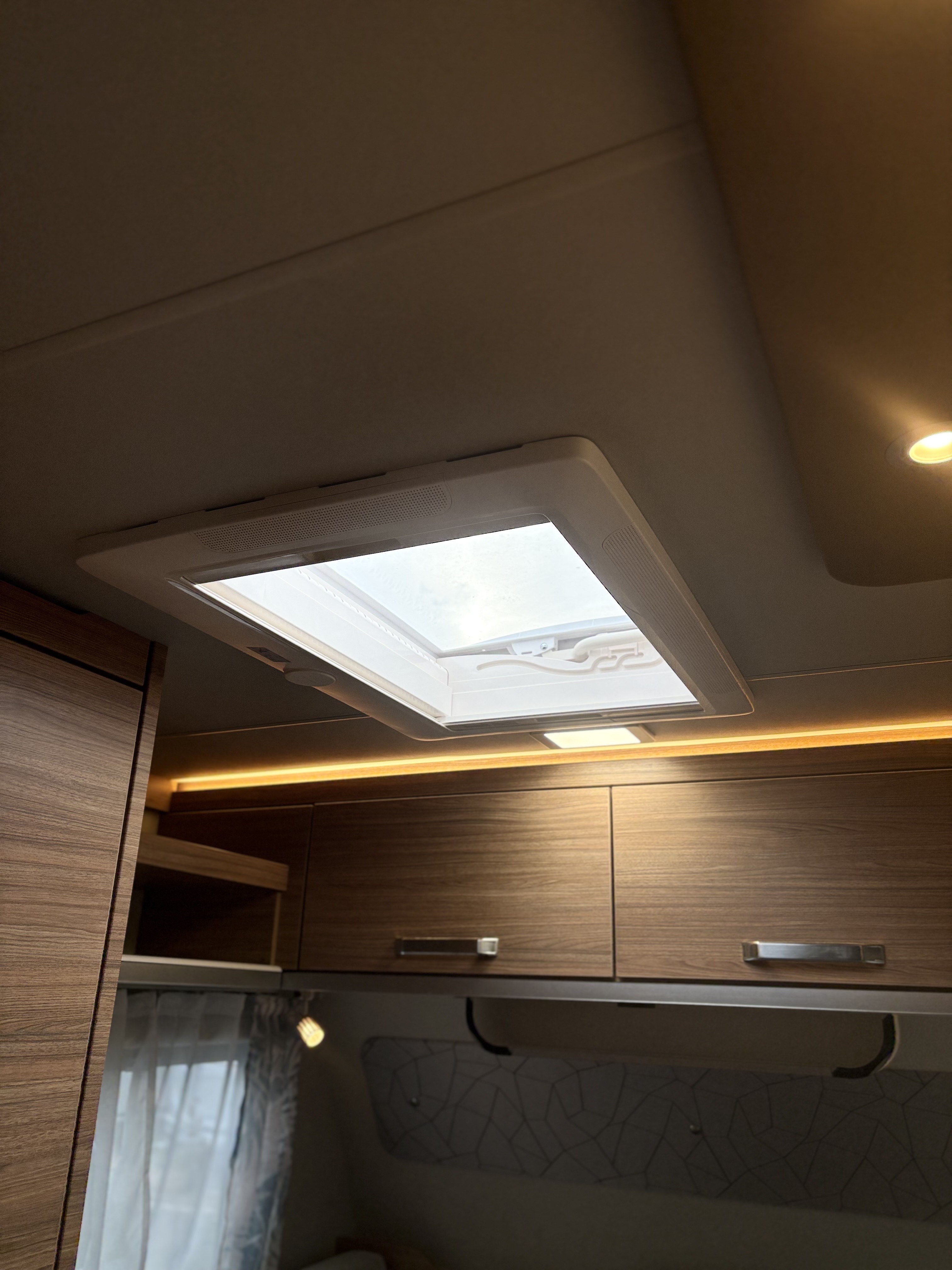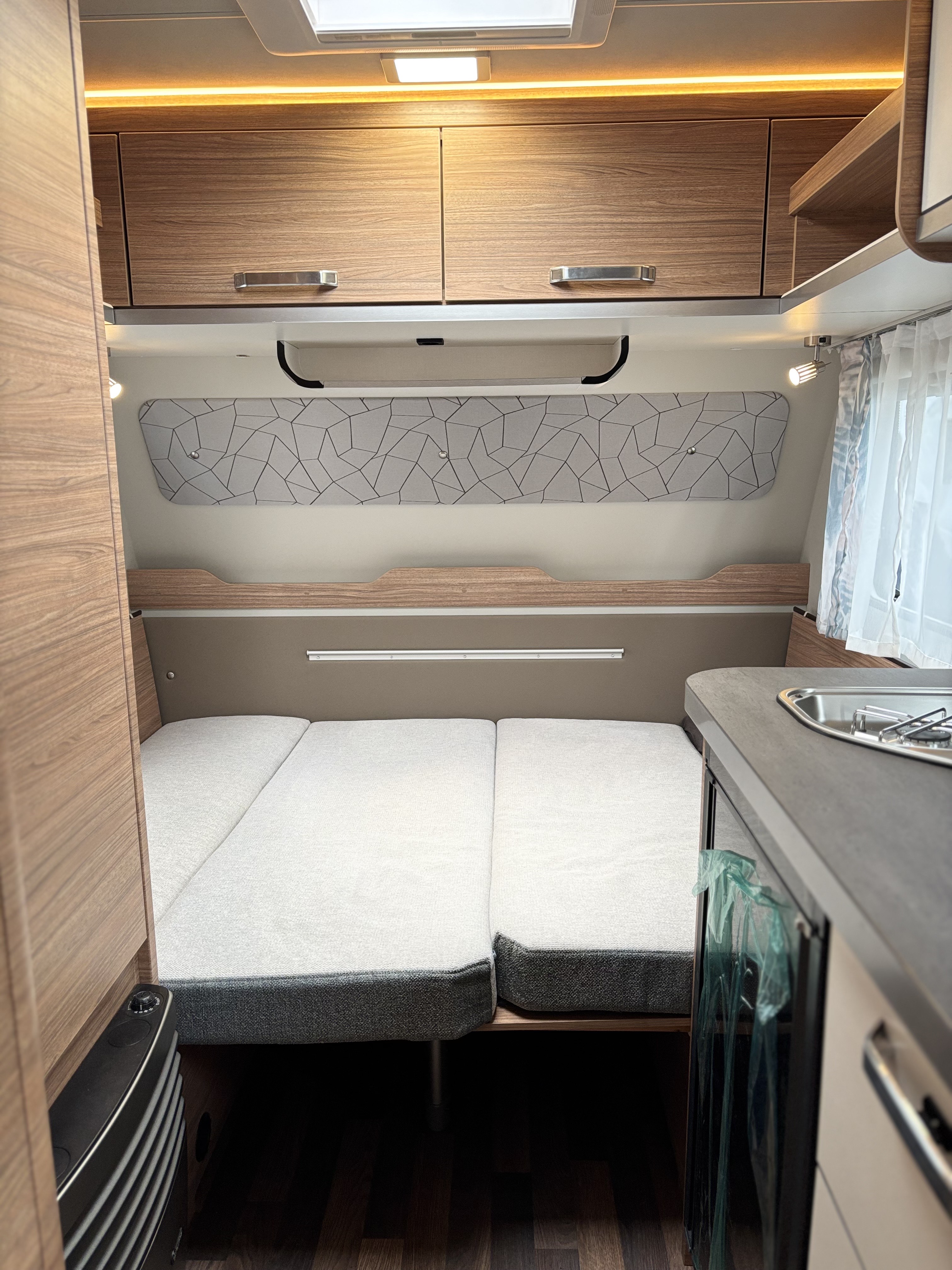 Mosogató, hűtő, tűzhely, 12V-os körfűtés, beépített mosdófülke zuhanytálcával és beépített bio-Wc-vel, kombirolók, szúnyoghálós ajtó, hideg-meleg vízrendszer, 45 l-es beépített víztartály, 25l-es mobil szennyvíztartály, panoráma tetőablak, stabilizátoros vonófej