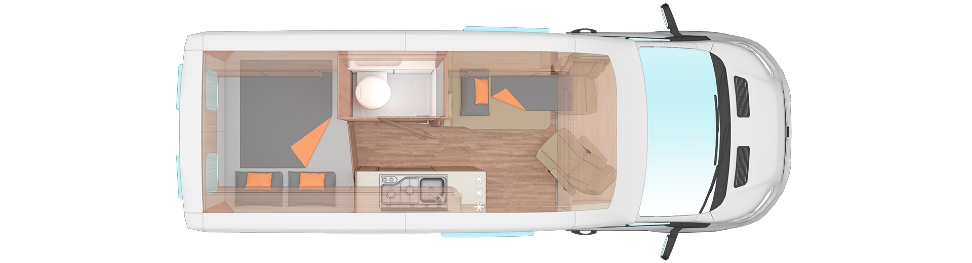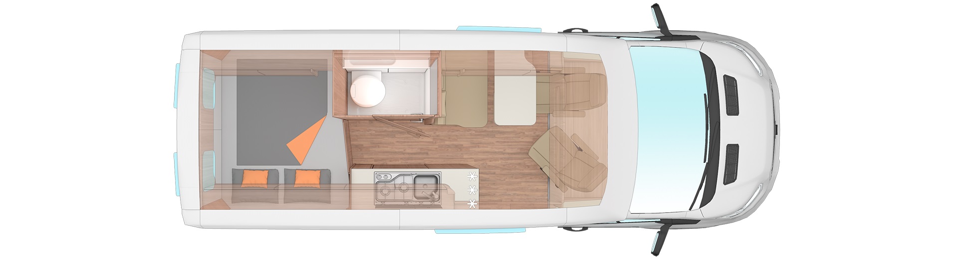 forgatható vezető- és utasoldali ülés, kartámaszok, vezető fülke sötétítő rolók, kombirolók, panoráma tetőablak, mosogató, 95l hűtő 12.8l-es mélyhűtő rekesszel, tűzhely, Truma 6 combi fűtés, beépített 12l-es Truma gázbojler, 100l beépített víztartály, 75l szennyvíztartály, mosdófülke beépített bio-Wc-vel és zuhanytálcával,  hátsó fekhely alatt nagy pakoló, elektromos fellépő, Truma iNet-System központi vezérlő egység, ledes dekorvilágítás, tolatókamera, szúnyoghálós ajtó, S7P ablak, Tv kábel előkészítés lakótérben,