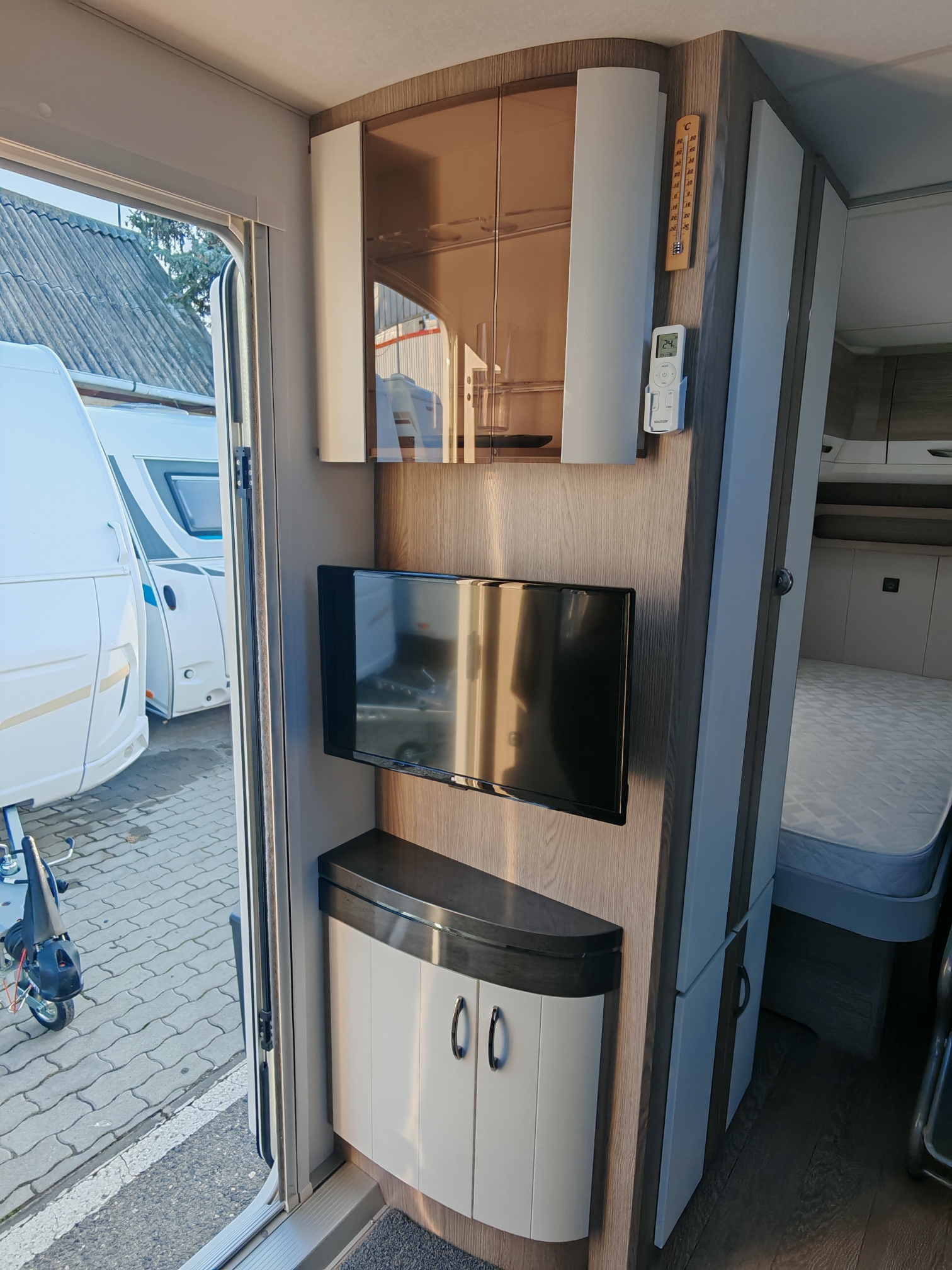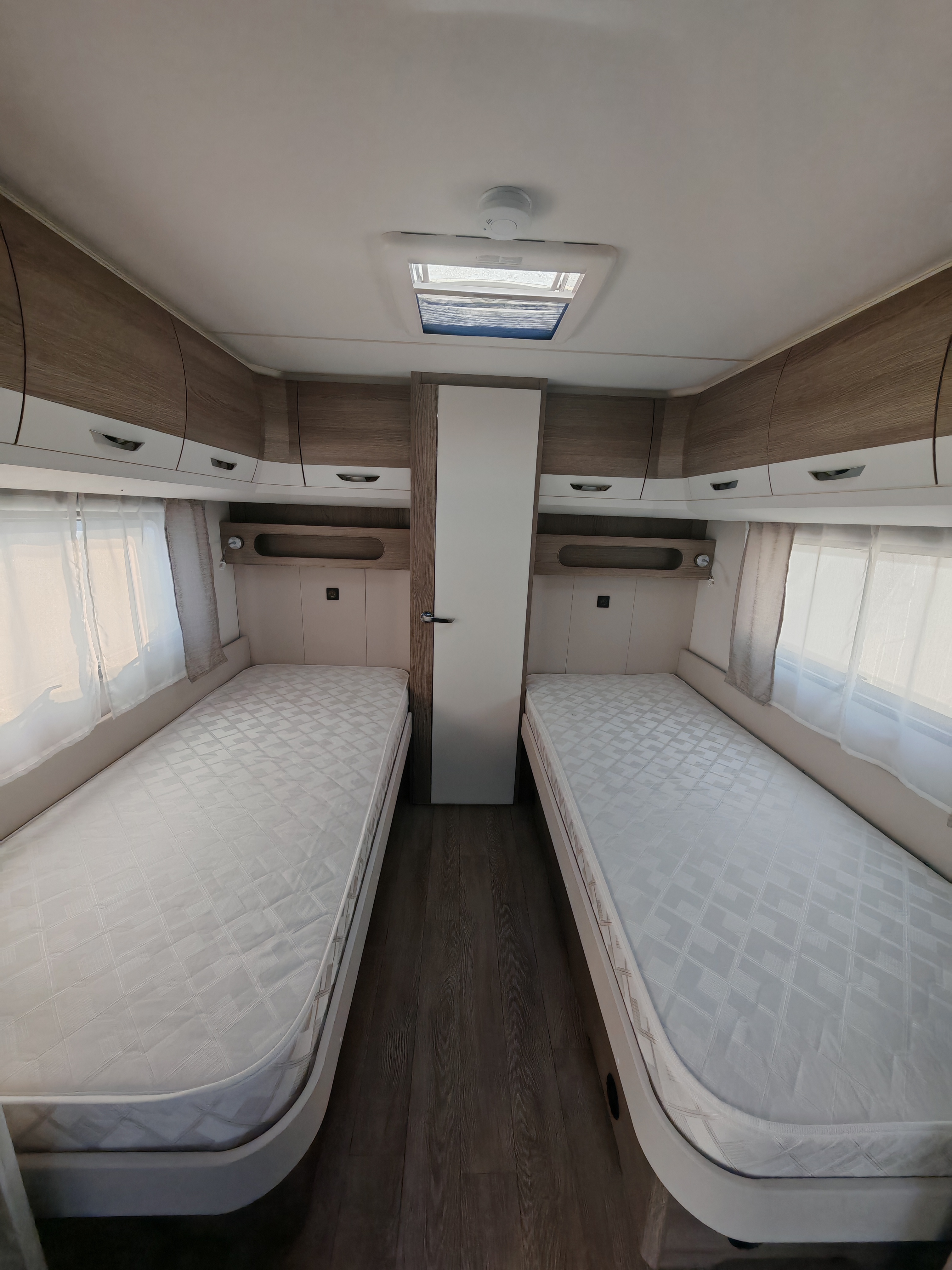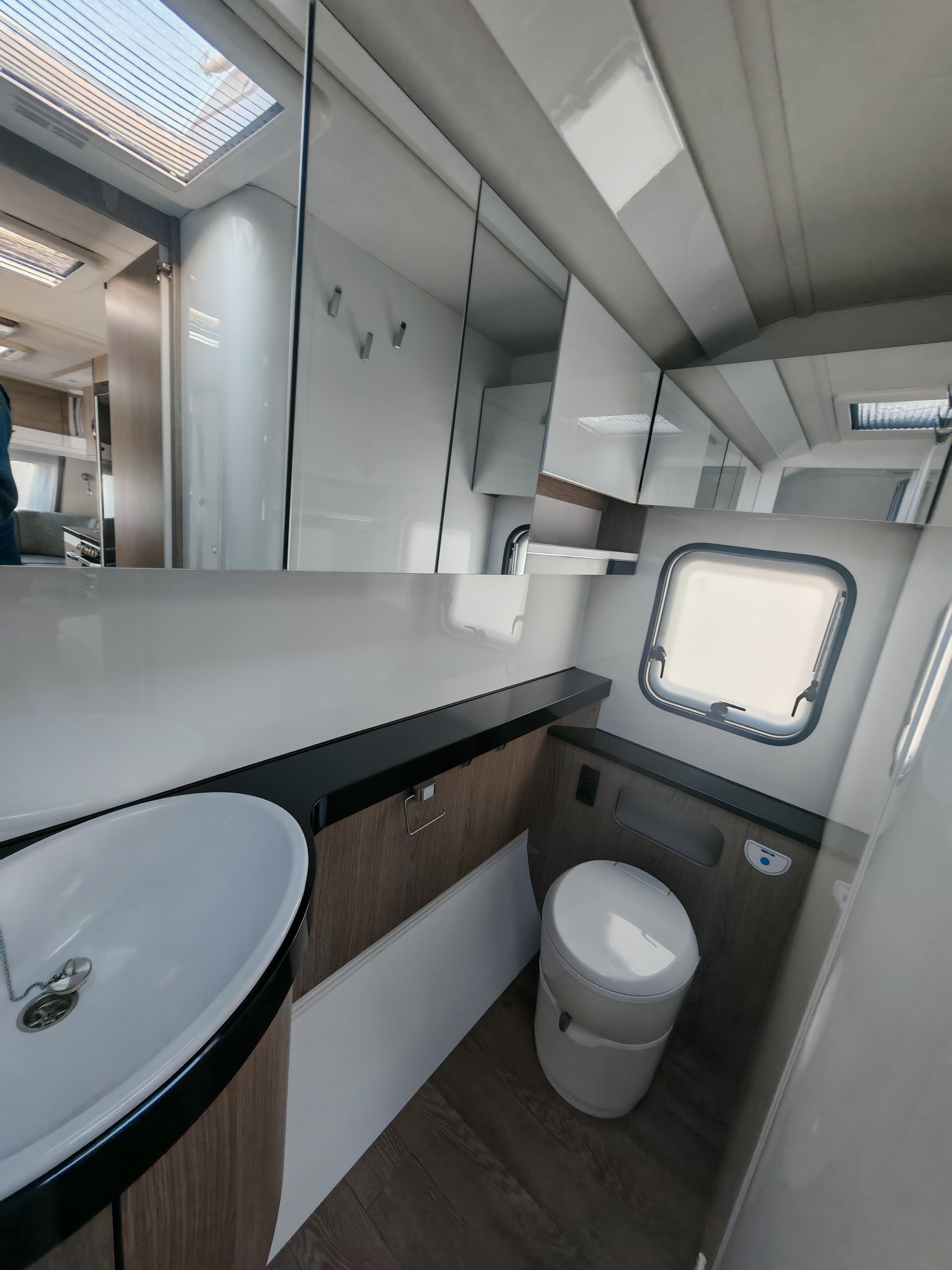 Fekvőhelyek száma: 4 fő, mosogató, toronyhűtő, 3 égőfejes tűzhely, Thetford sütő, mosdófülke beépített bio-Wc-vel és zuhanytálcával,  hideg-meleg vízrendszer, beépített víztartály, szennyvíztartály, panoráma tetőablak, kombirolók, Truma INet központ, gázriasztó, térelválasztó,  gardróbszekrény, olvasólámpa, Sinclair tetőklíma, TV, padlófűtés, Truma Combi gáz-elektromos kazán