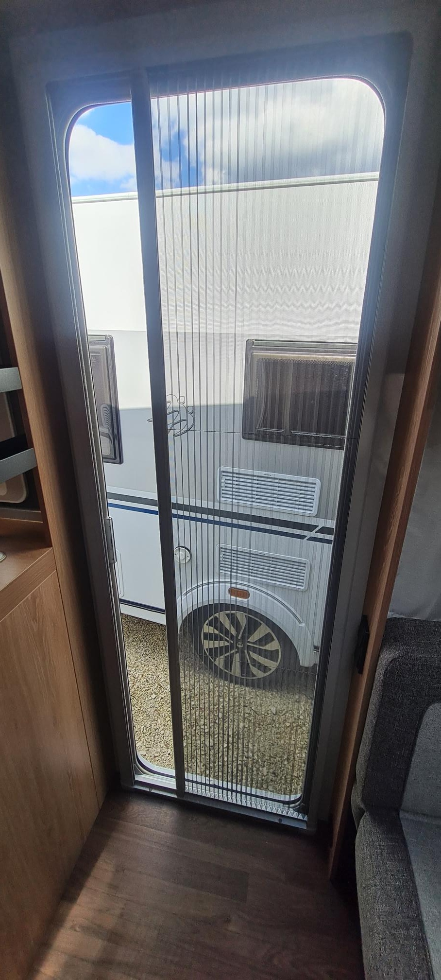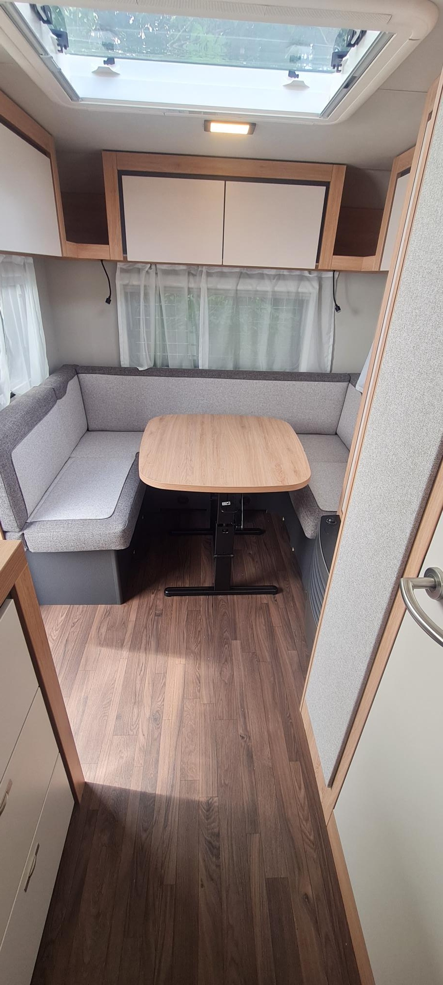 Mosogató, 110 L-es automata hűtő, tűzhely, körfűtés, mosdófülke beépített bio-wc-vel, hideg-meleg vízrendszer, 45L-es tiszta víztartály, külső vízbetöltőnyílás, kombirolók, térelválasztó, szervizajtó, panoráma tetőablak, pótkeréktartó, stabilizátoros vonófej, Rollbett a két ágy között, súlymérős orrkerék, Truma 5 L-es villanybojler, Truma kájha
