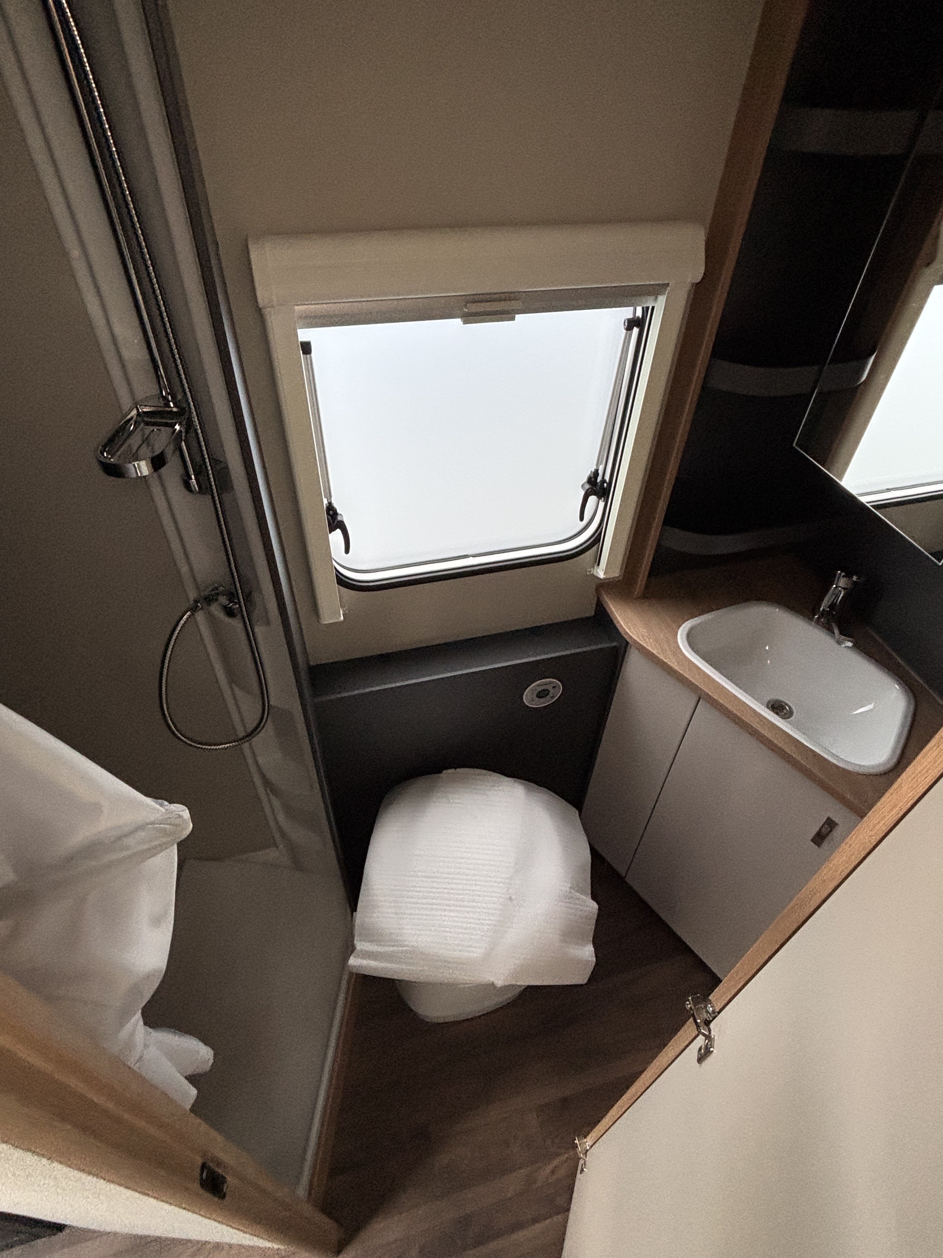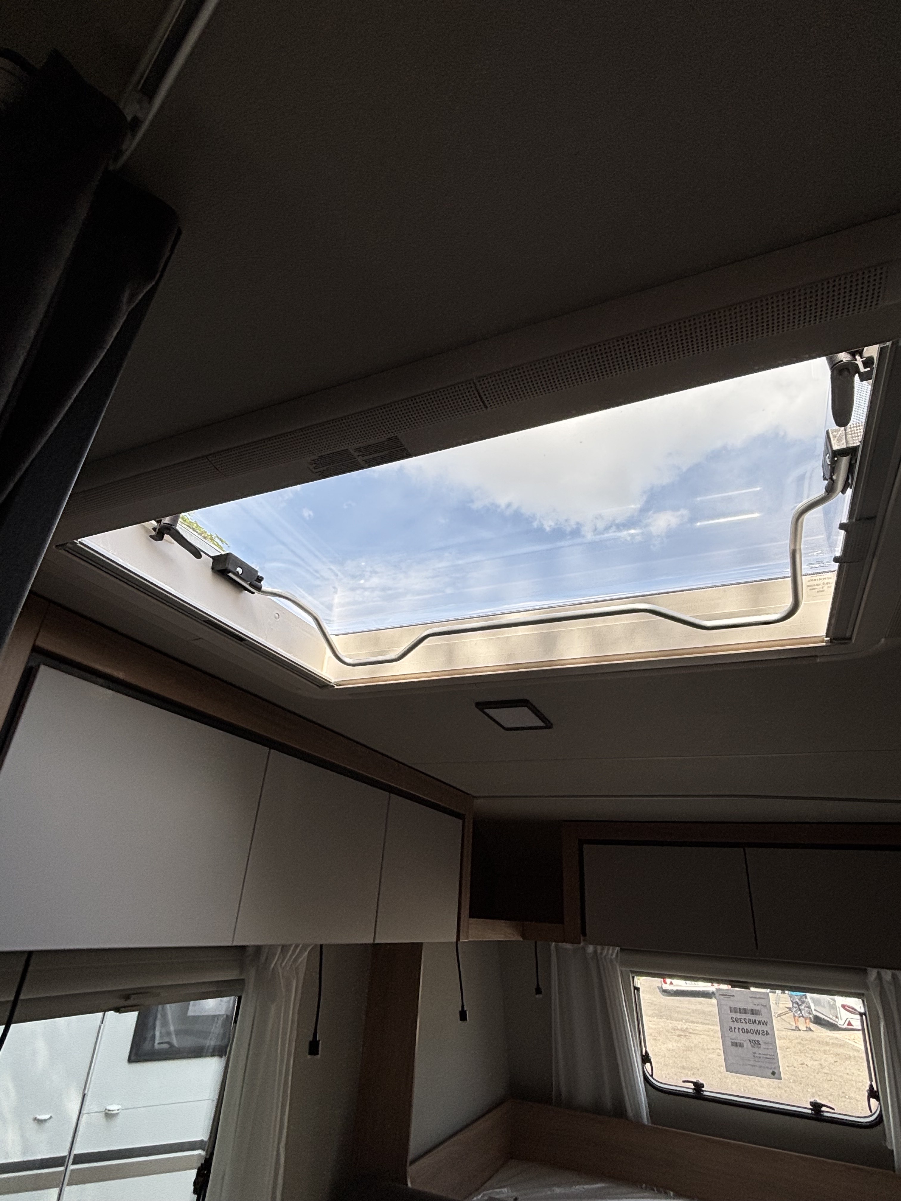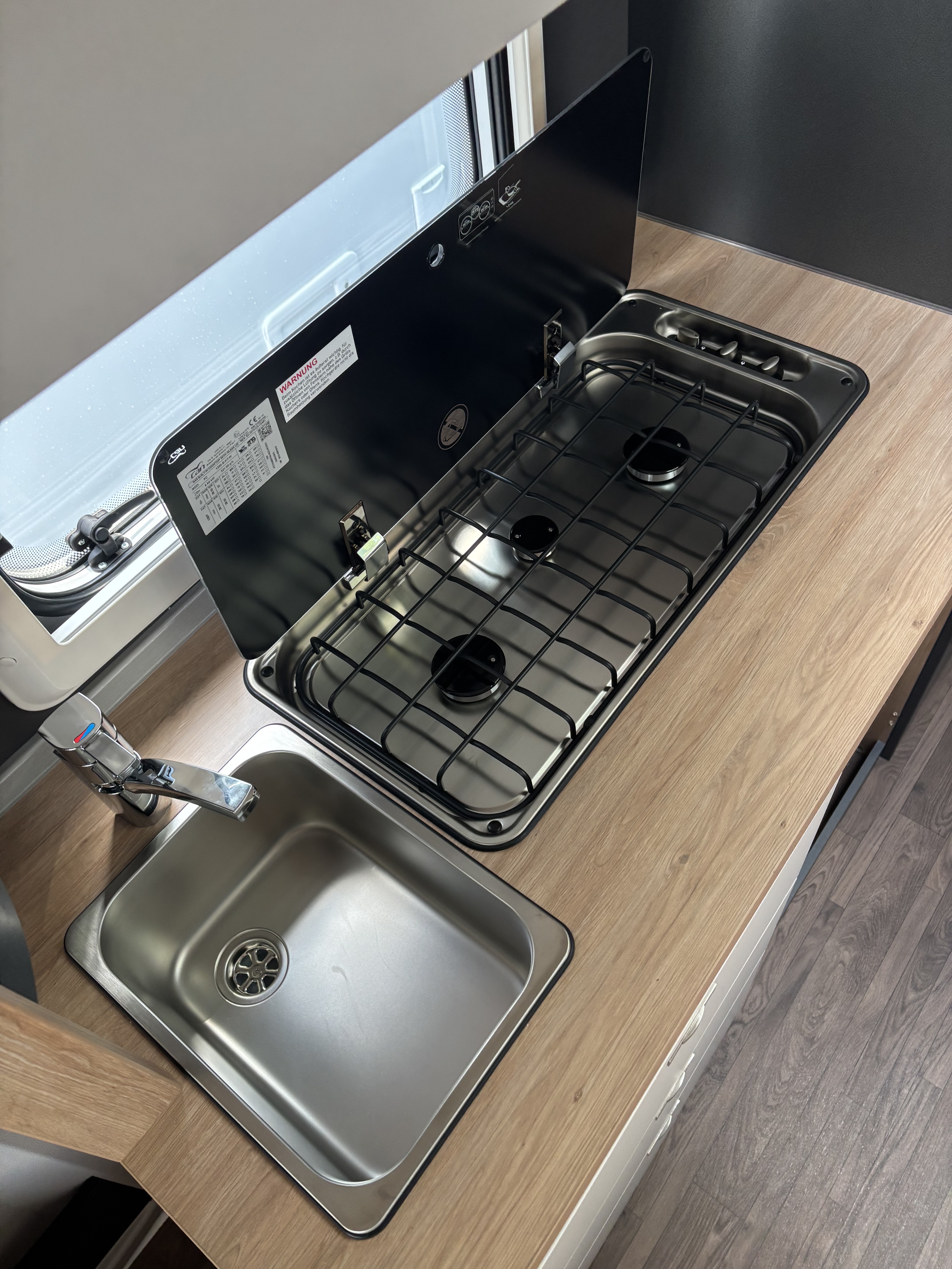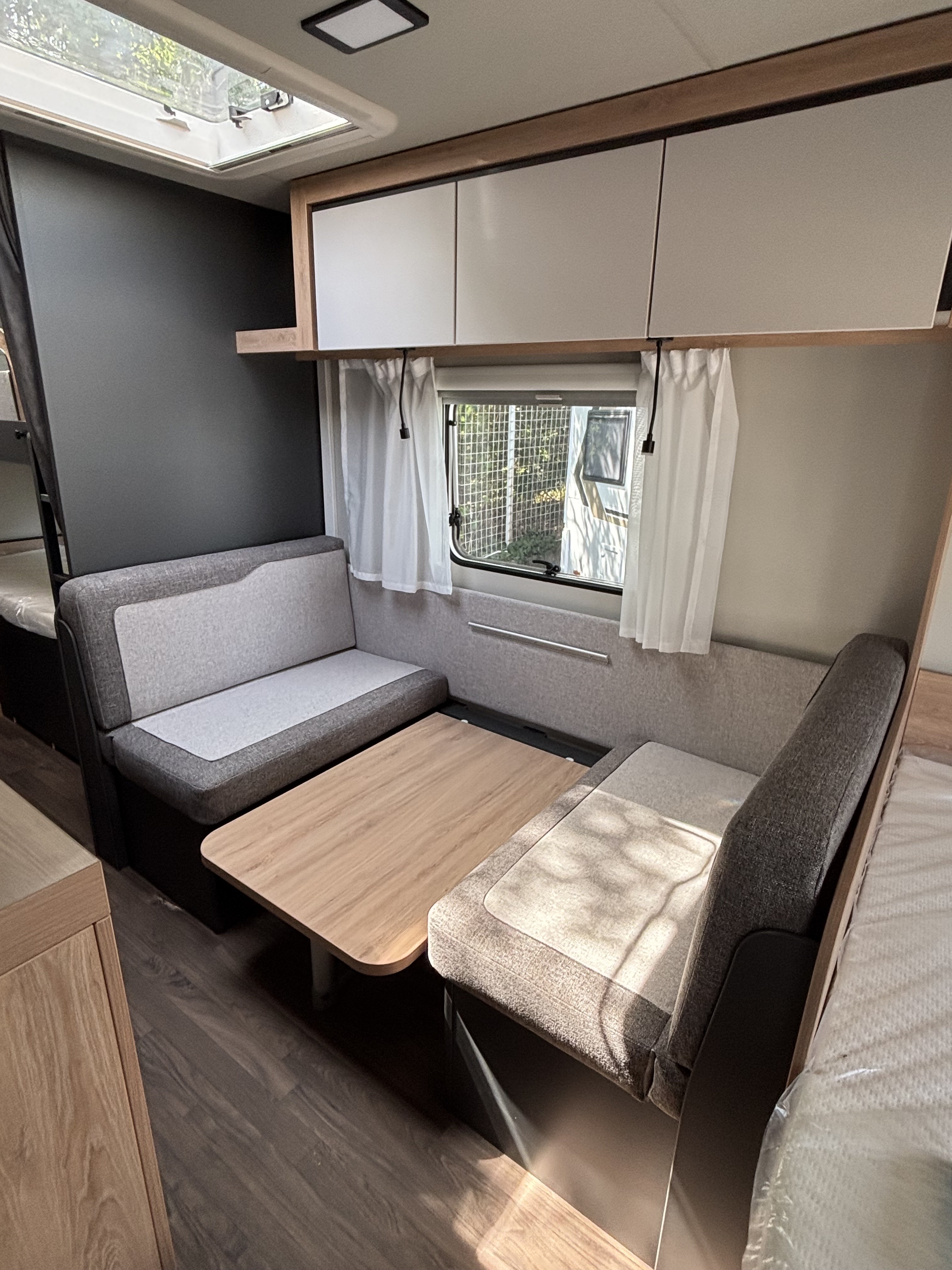 Mosogató, 142 L-es Thetford automata hűtő, 3 égőfejes tűzhely, 45L-es beépített víztartály, mosdófülke beépített bio-Wc-vel, hideg-meleg vízrendszer, külső vízbetöltőnyílás, Truma S 5004 gázfűtés, kombiroló, szugonyhálós ajtó, 40 cm x 40 cm-es tetőablak hátul, térelválasztó, EvoPore HRC matrac, emeletes ágy, összecsukható ruhaállvány, LED belső hangukat világítás