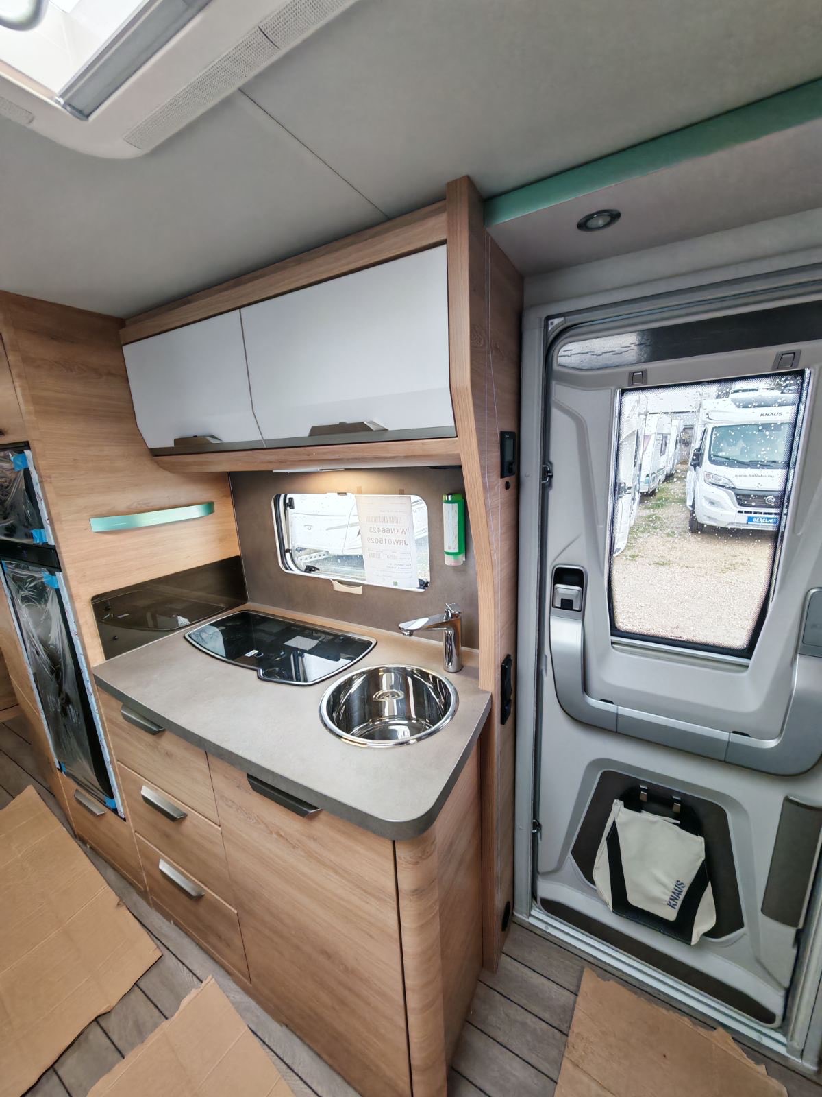 Mosogató, 3 égőfejes gáztűzhely, Dometic 177 L-es automata toronyhűtő - fagyasztóval, Truma 5002 gázfűtés - körfűtéssel, komfortos fürdőszoba külön tusolóval és beépített bio-wc-vel,