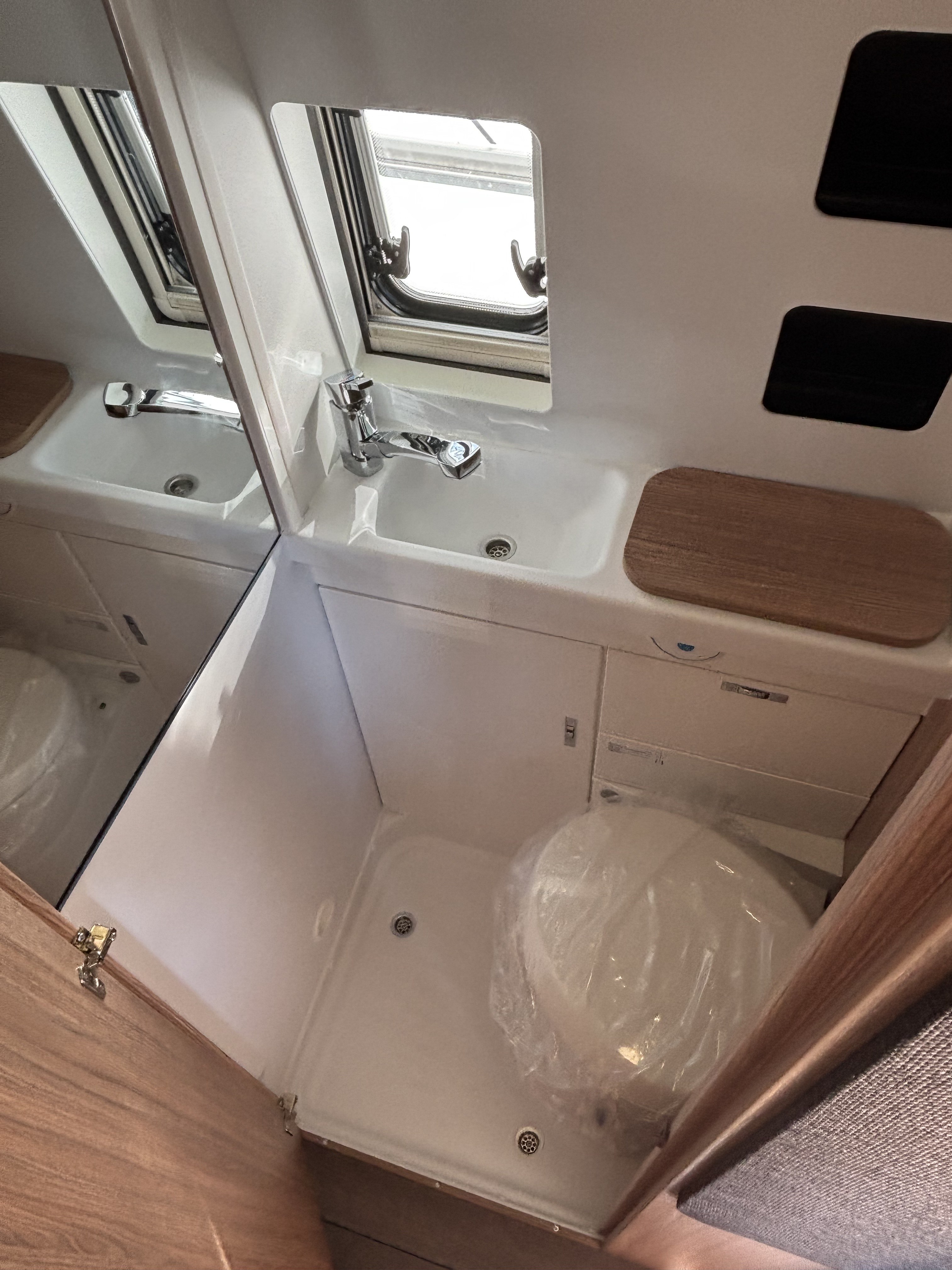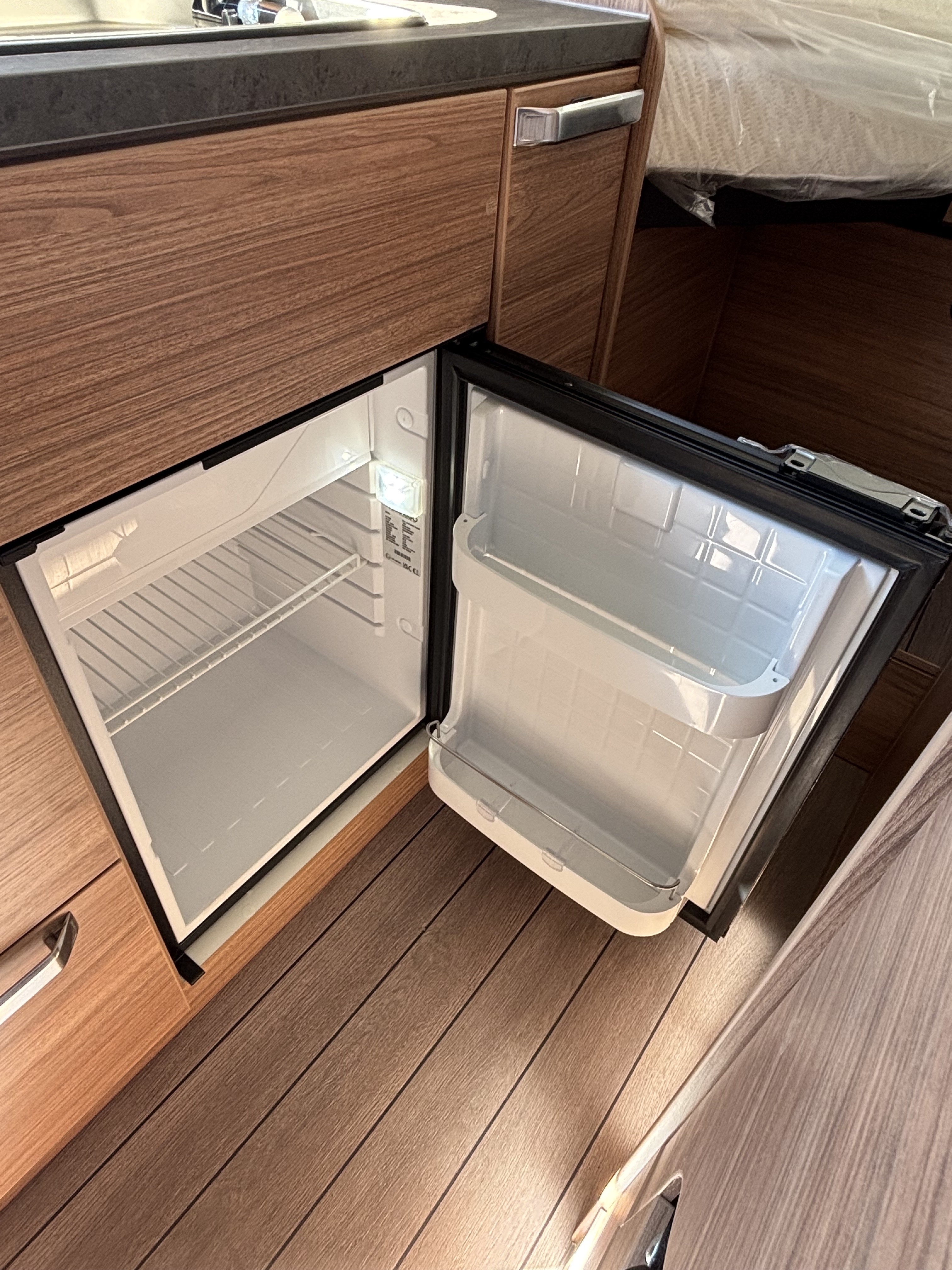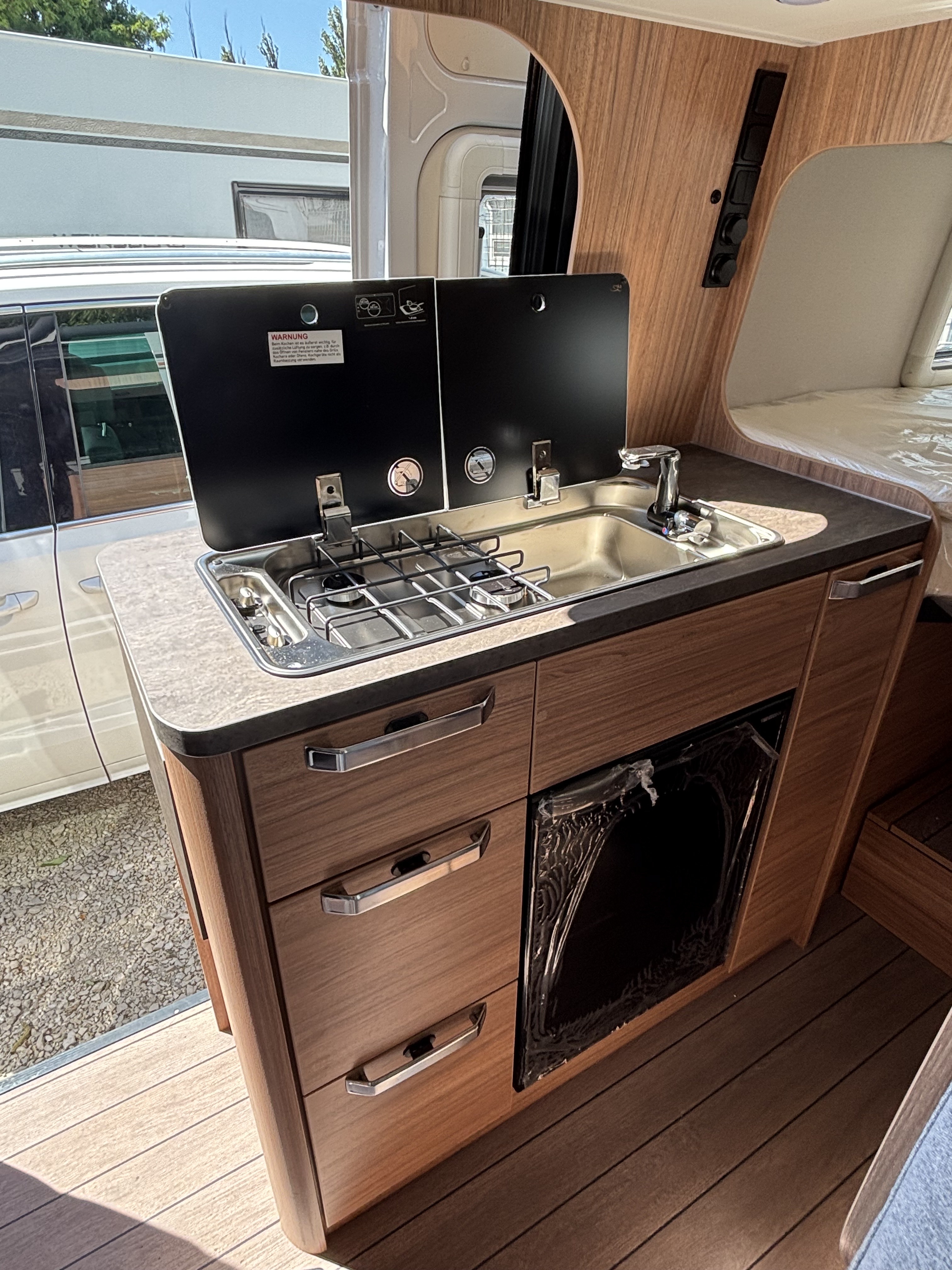 mosogató, tűzhely, 102l beépített víztartály, 90l beépített szennyvíztartály, 75 L hűtő 10,2 L fagyasztó, mosdófülke beépített bio-Wc-vel és zuhanyzóval, Thetford elfordítható kazettás WC