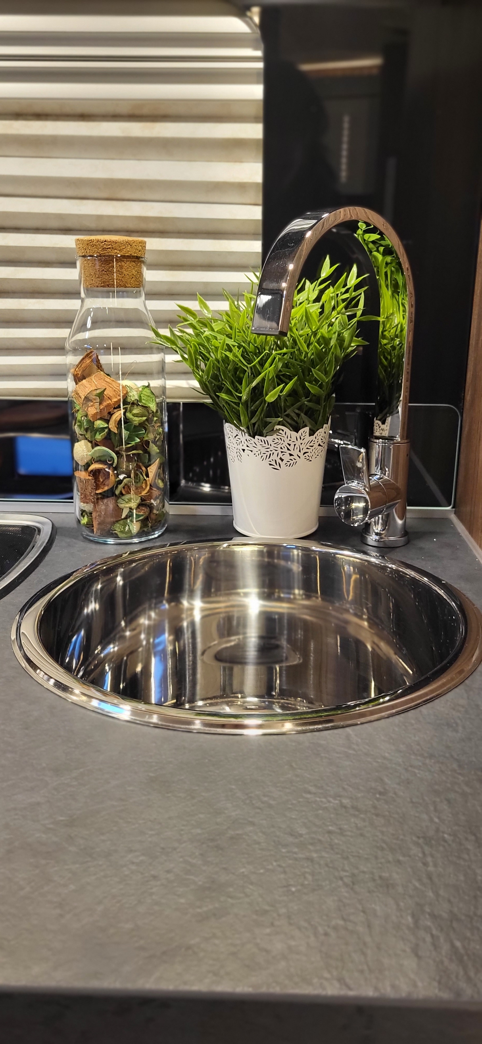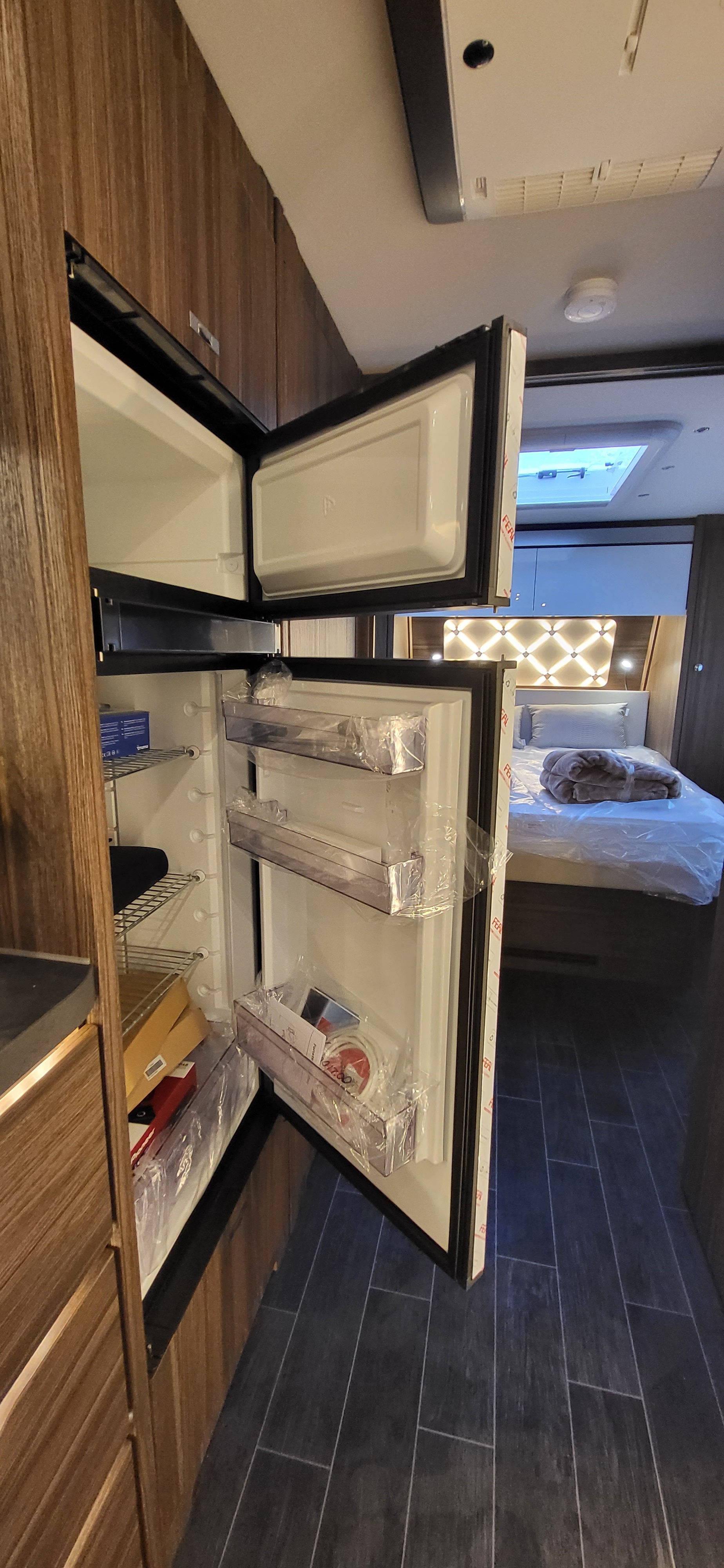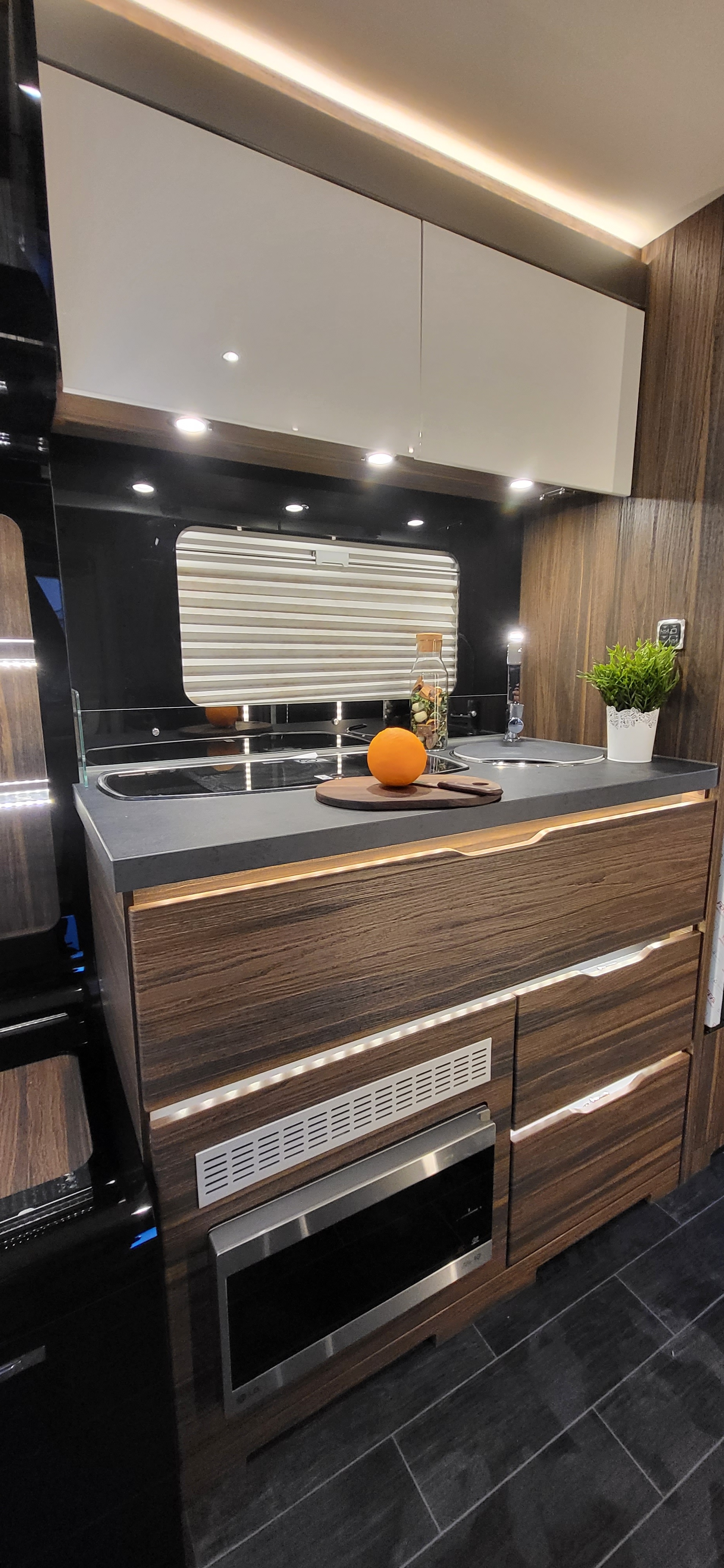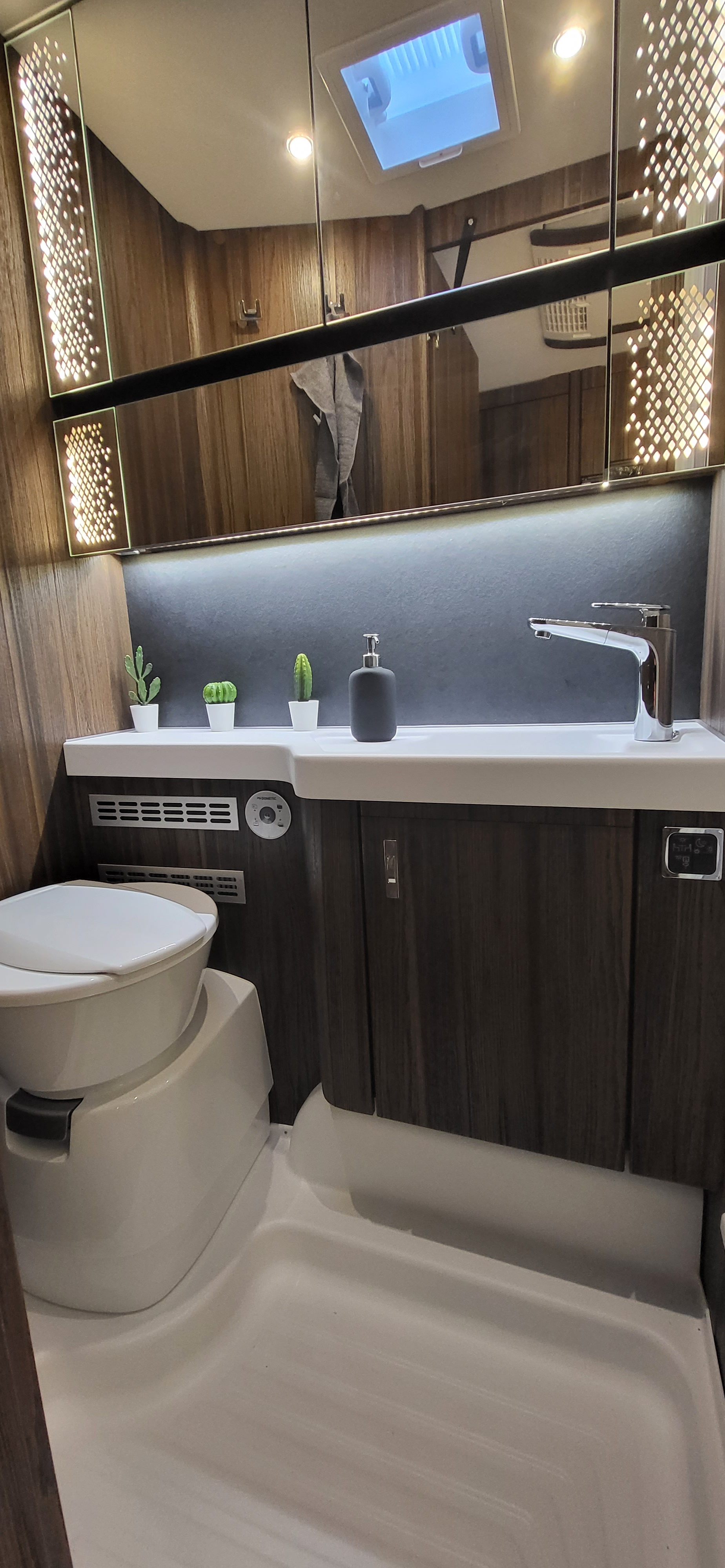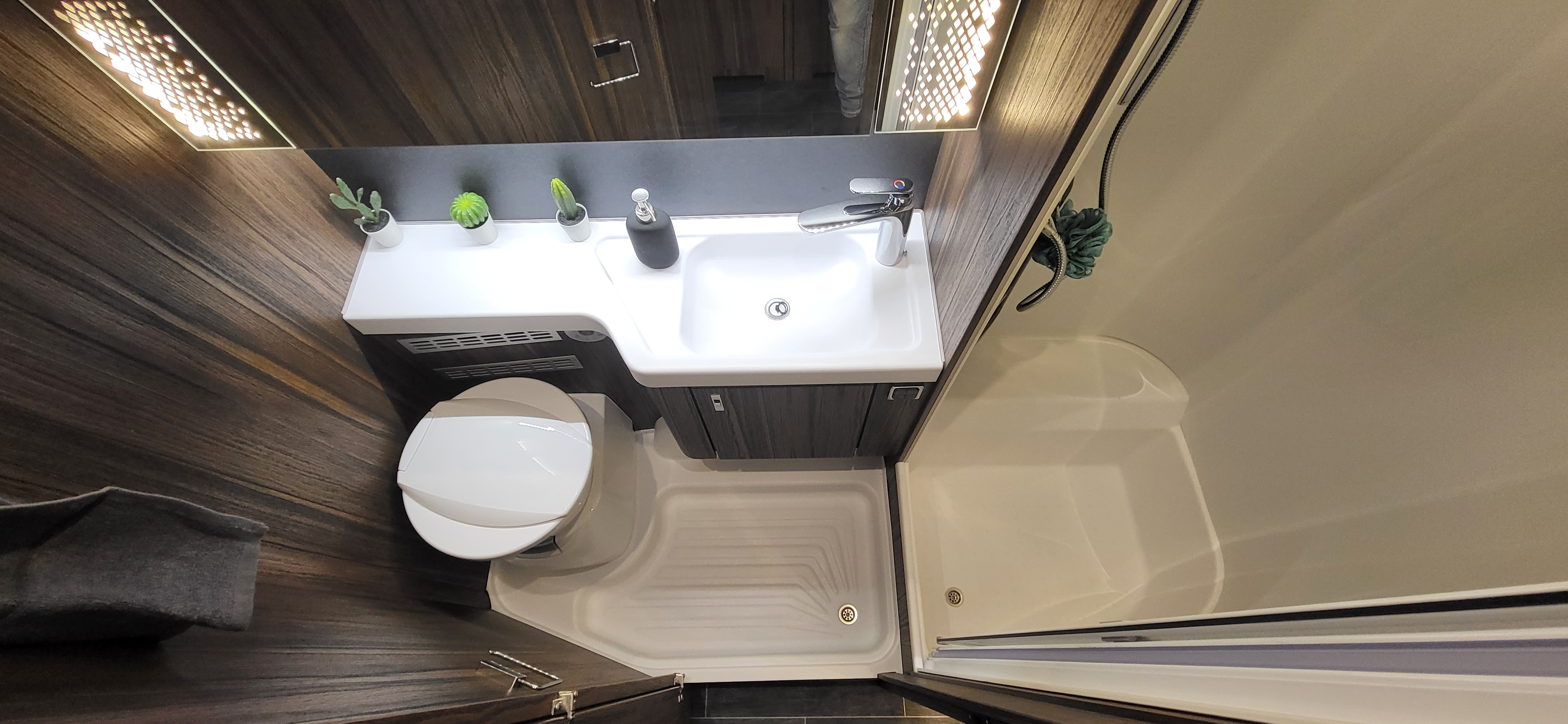 Alap felszereltség: Mosogató, 3 égőfejes gáztűzhely, Dometic 177L-es automata toronyhűtő - fagyasztóval, komfortos fürdőszoba tusolóval és beépített bio-wc-vel,